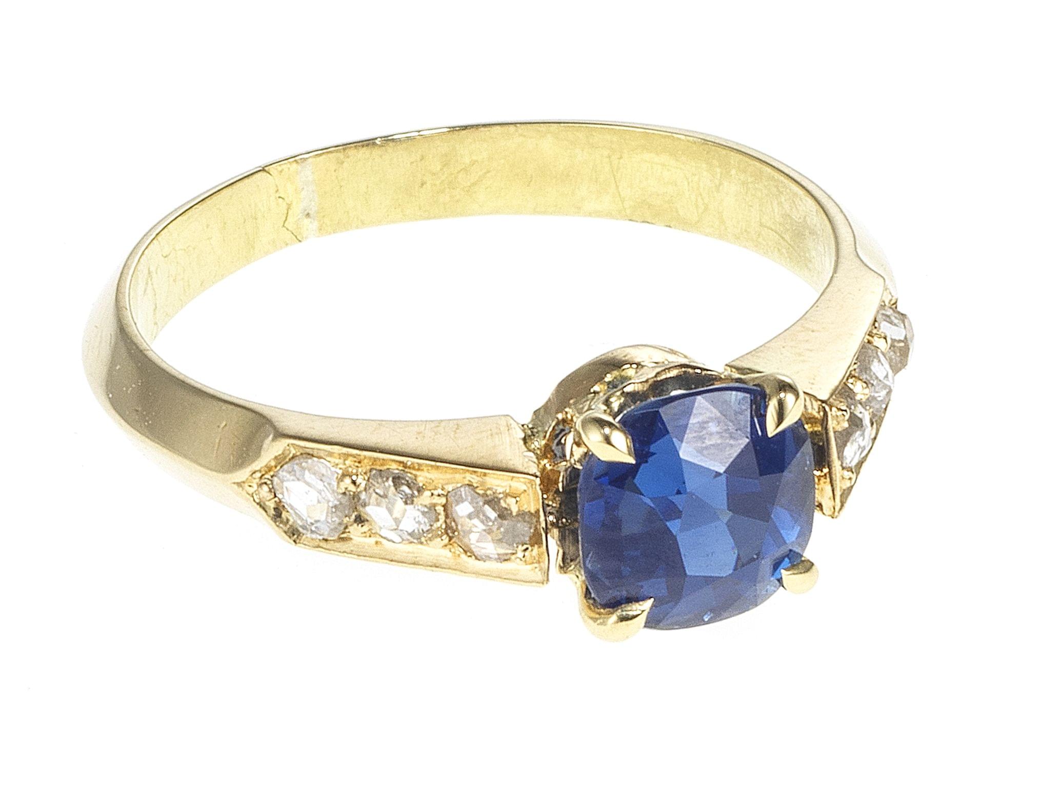 3427. Bague sertie d'un saphir taille coussin (env.1,2 ct) probablement non chauffé épaulé de roses de diamants