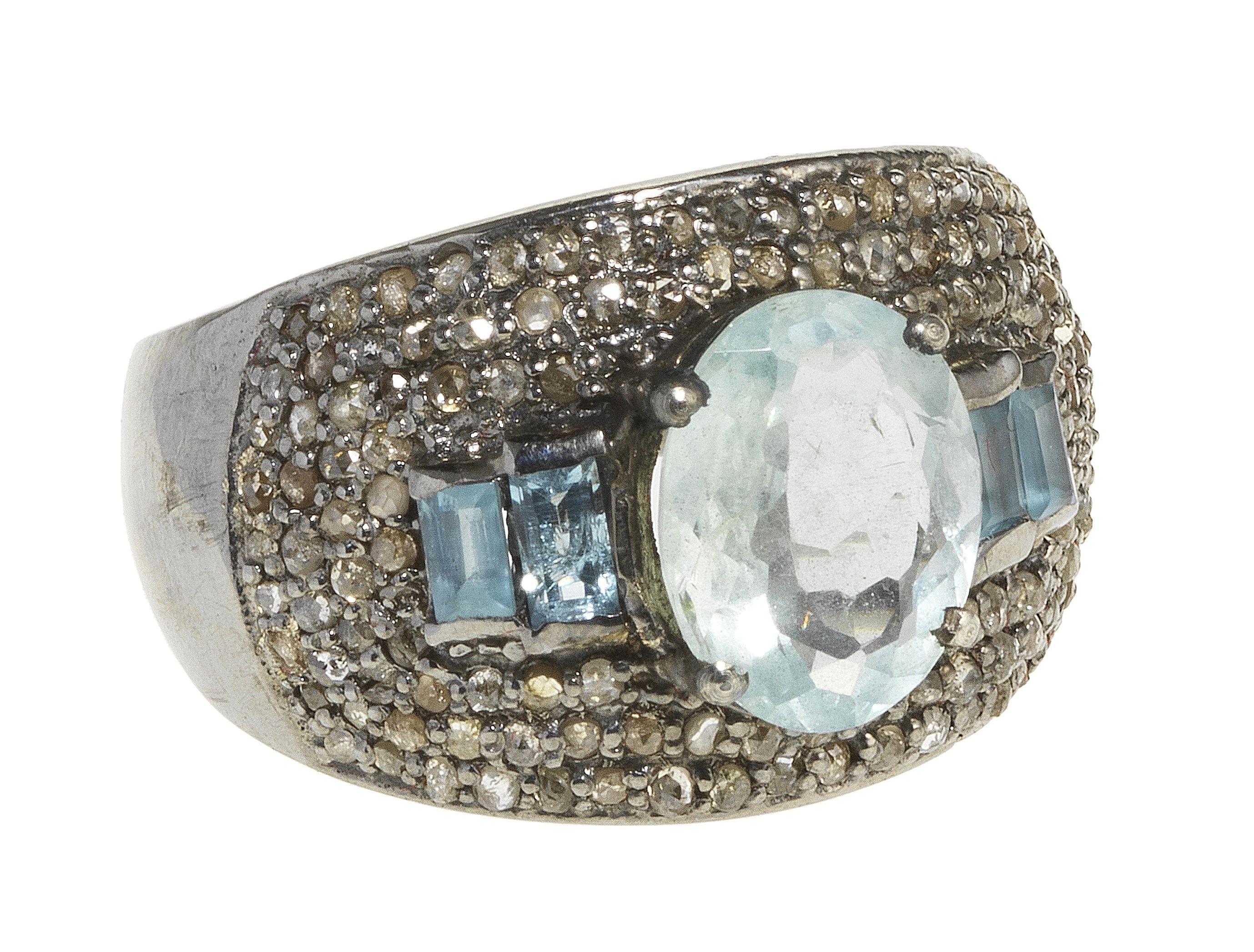 Epaulée d'aigues-marines taille baguette sur une monture pavée de roses de diamant, argent 925, doigt 55-15. Pour les lots précédés d'un *, la TVA de 7,7% est due sur l'entier du prix d'adjudication.