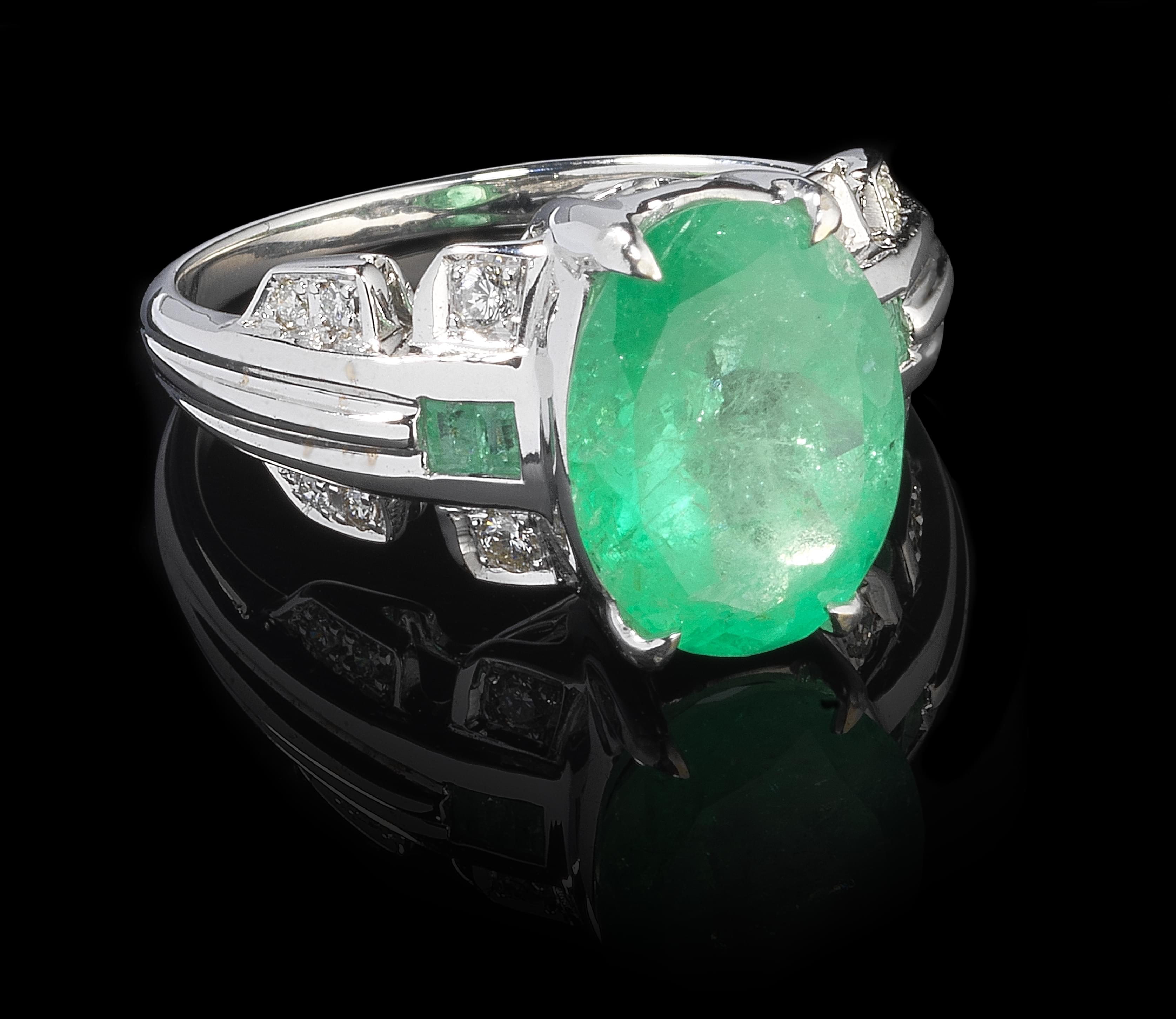 3518. *Bague sertie d'une émeraude colombienne minor oil taille ovale (3,0 ct)