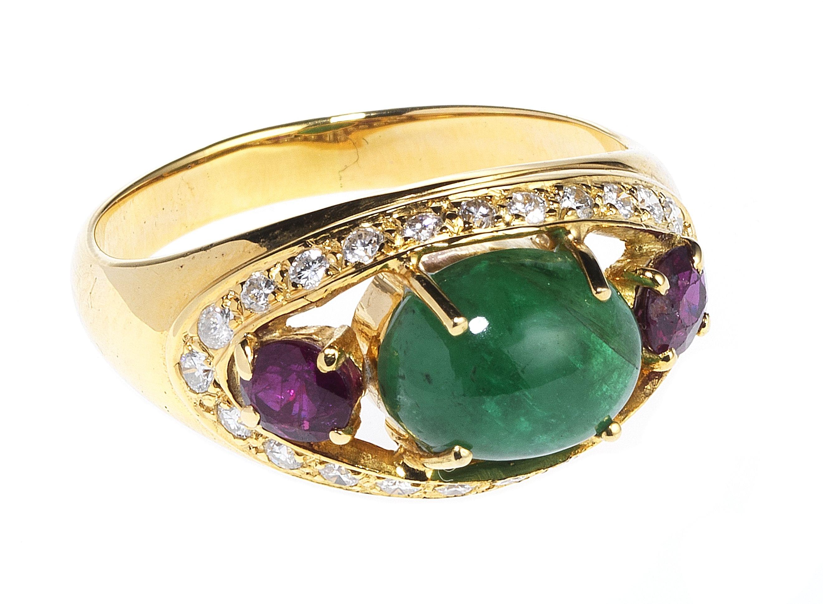3290. *Bague sertie d'une émeraude taille cabochon (env. 2 ct) épaulée de rubis taille ovale et entourée de diamants
