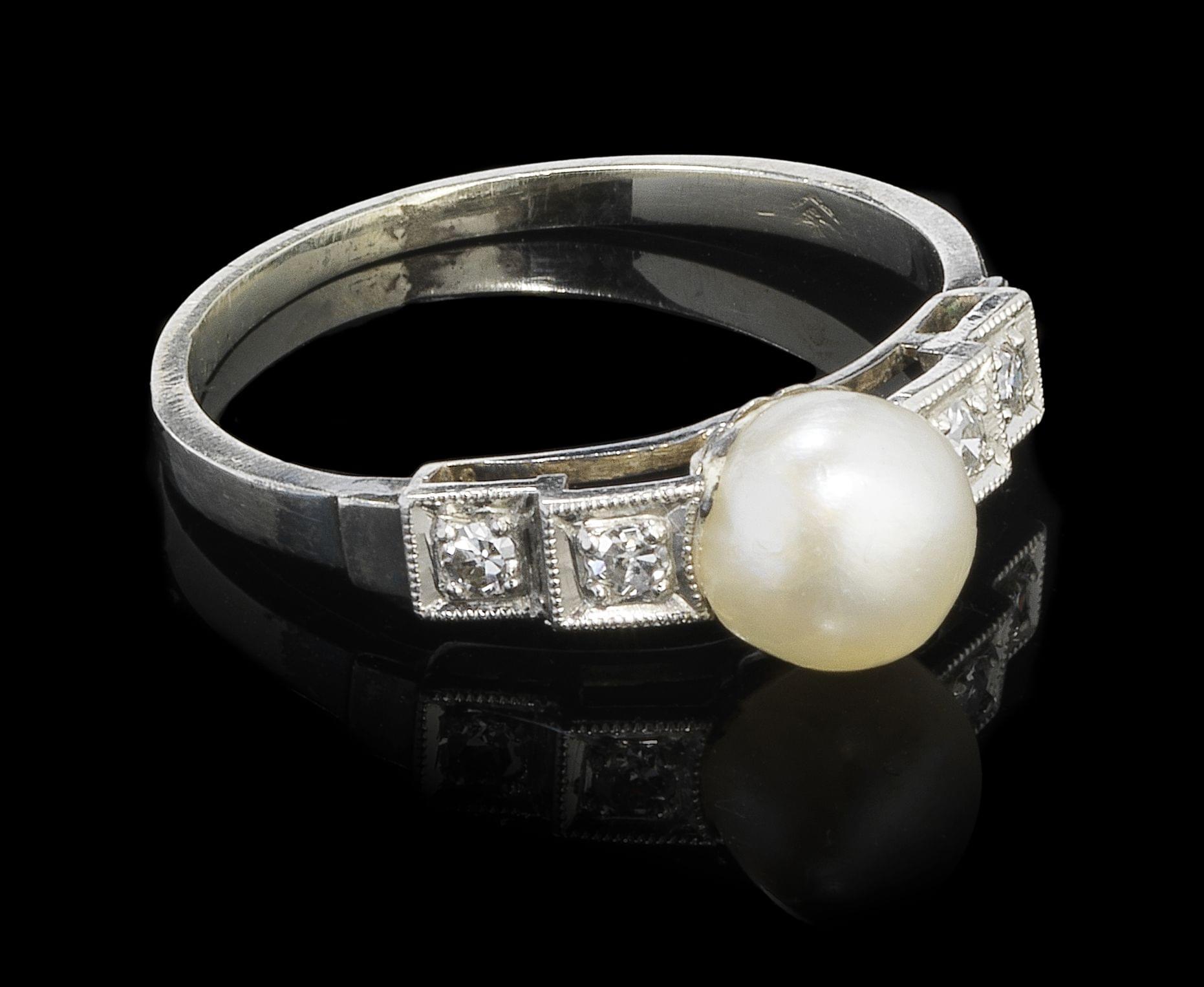 3364. Bague sertie d'une perle probablement fine (D env. 6,5 mm) épaulée de diamants taille 8/8