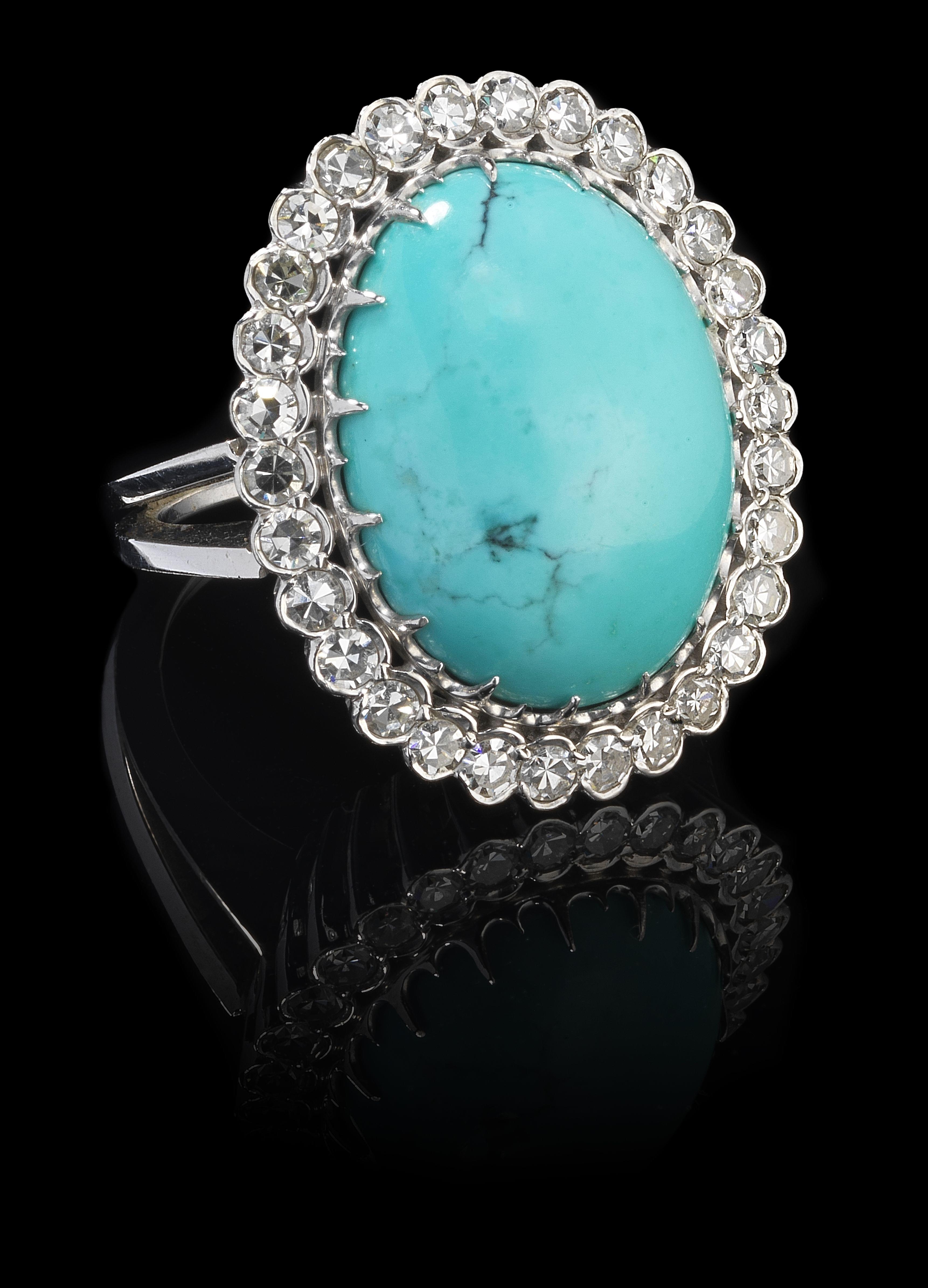 3344. Bague sertie d'une turquoise taille cabochon ovale entourée de diamants taille 8/8