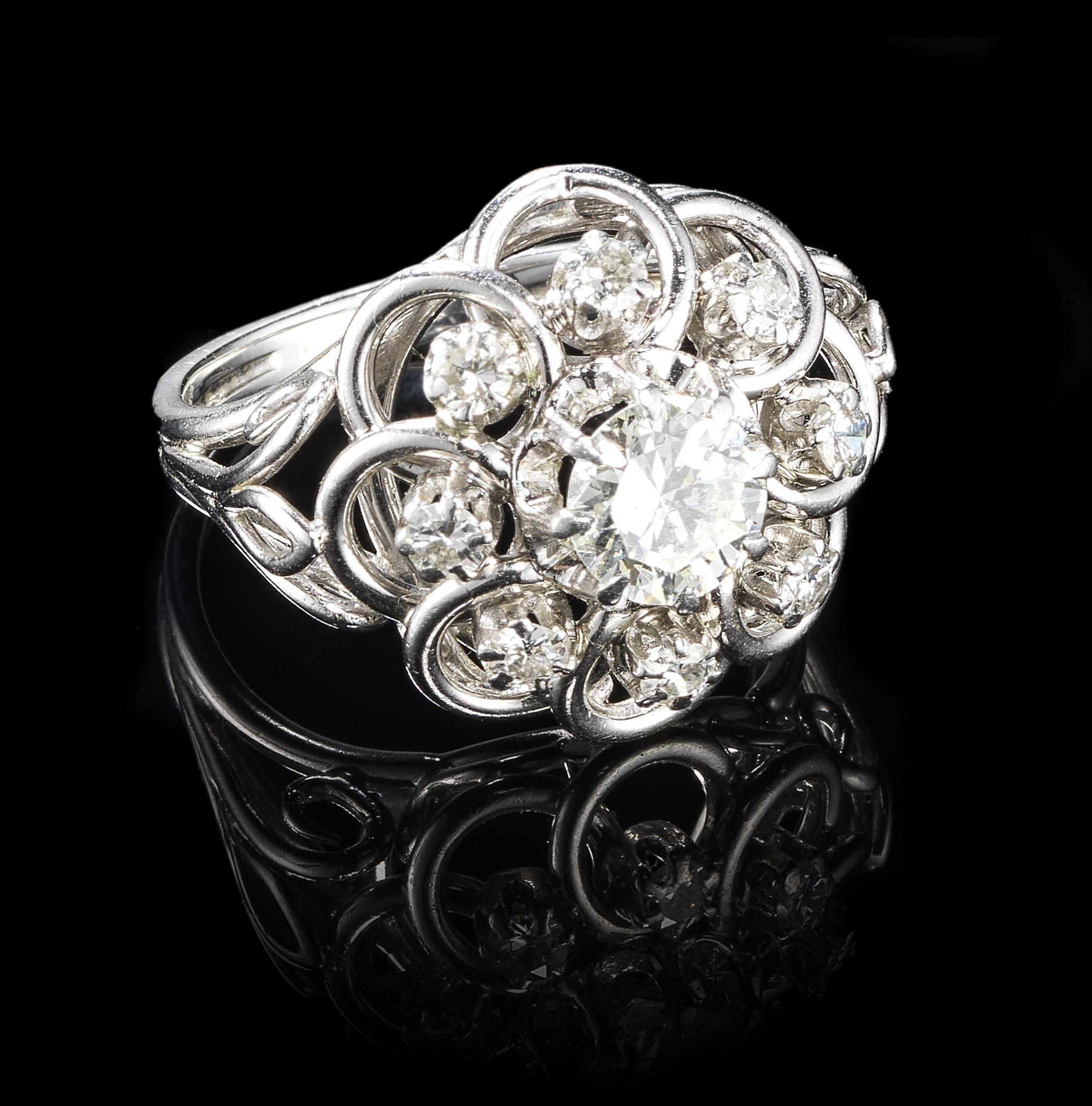 287. Bague sertie d'un diamant (env. 0,8 ct) entouré de huit diamants sur une monture ajourée