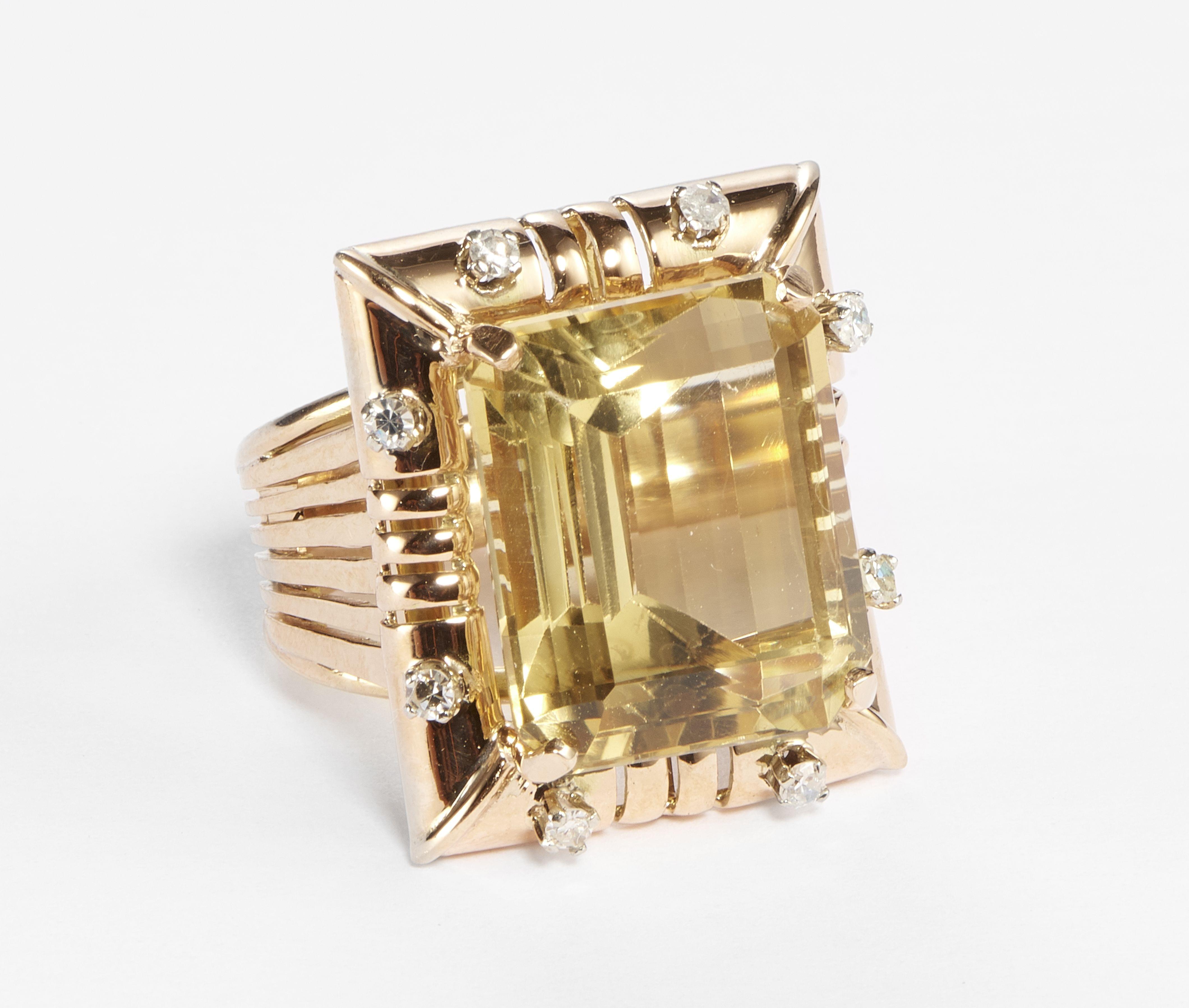 3197. Bague sertie d'une citrine taille rectangle (env. 15 ct) entourée de six petits diamants