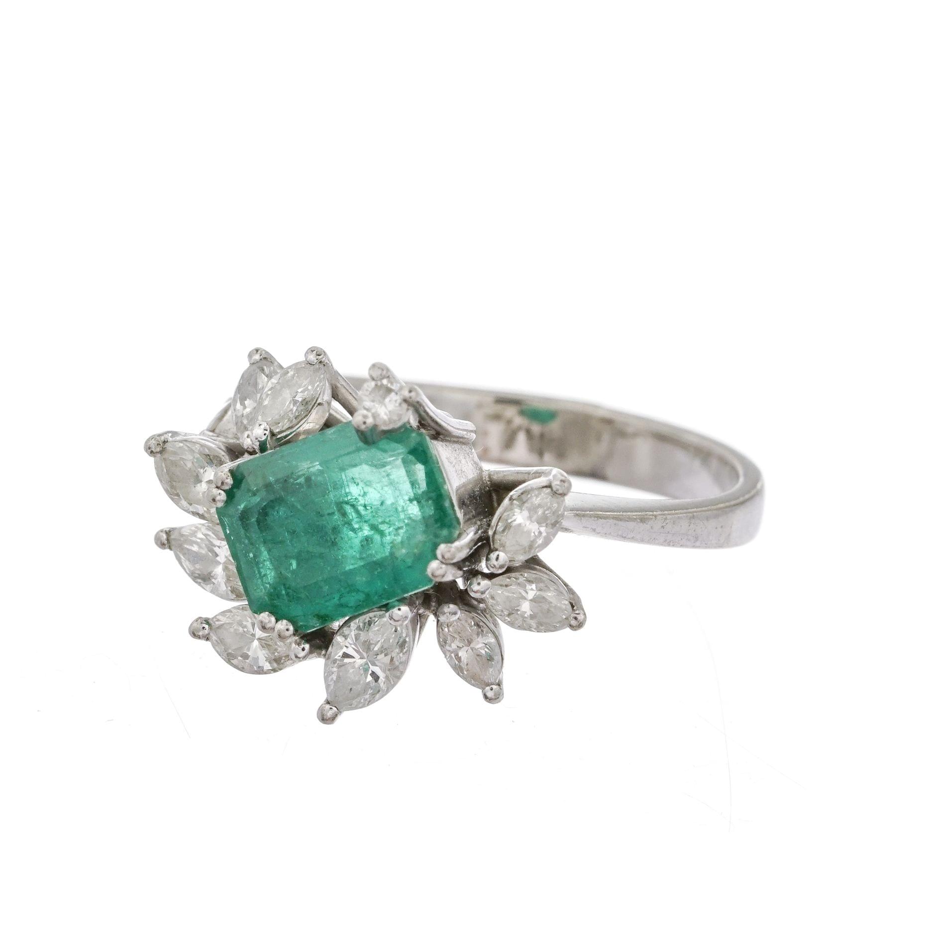 996. Bague sertie d'une émeraude taille rectangle (env. 1.4 ct) entourée de diamants taille marquise et brillant
