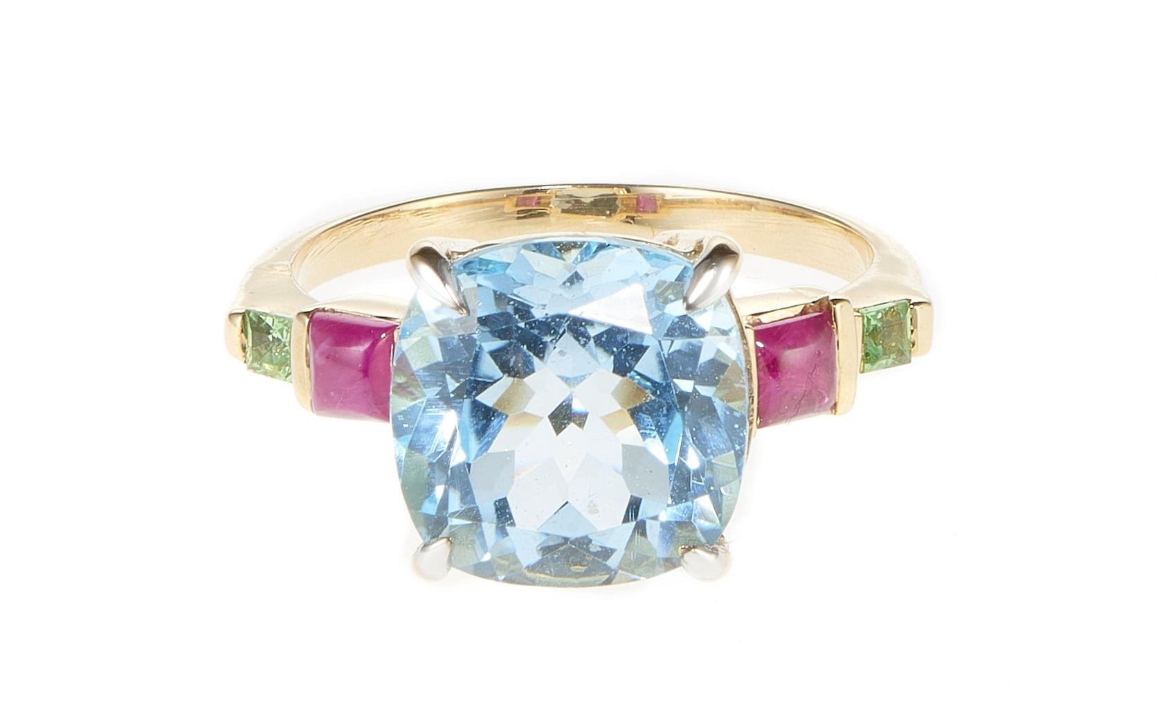 4270. Bague sertie d'une topaze taille coussin (env. 5,5 ct) épaulée de rubis et de tsavorites