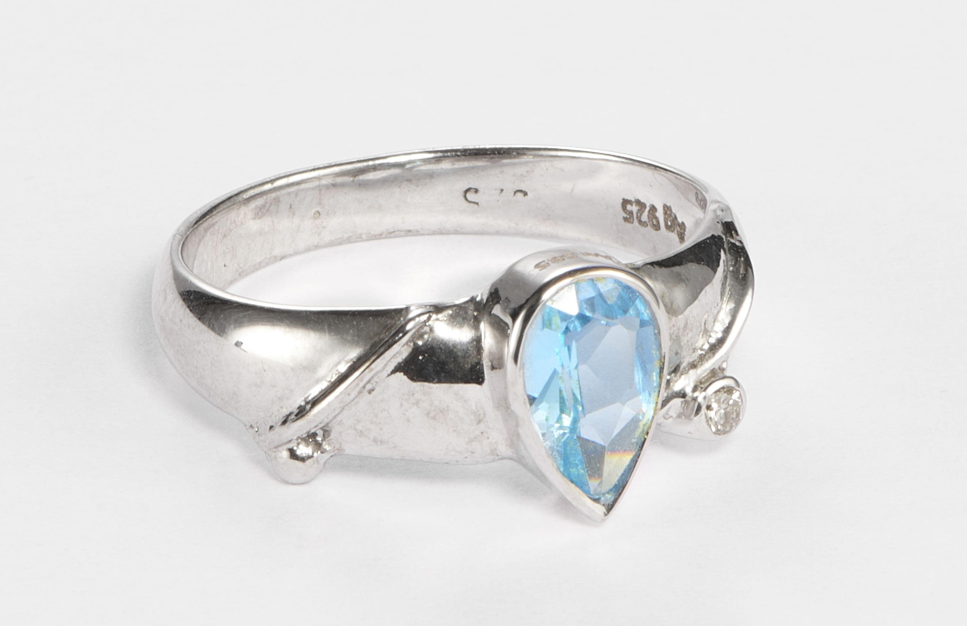 3149. *Bague stylisée sertie d'une topaze bleue taille poire (env. 0,9 ct) rehaussée d'un petit diamant