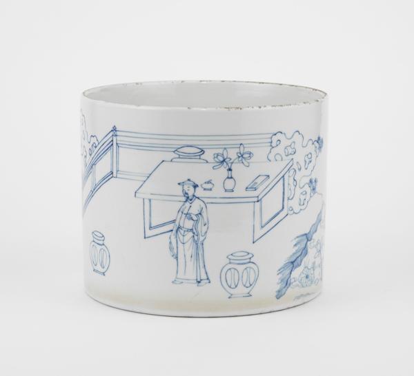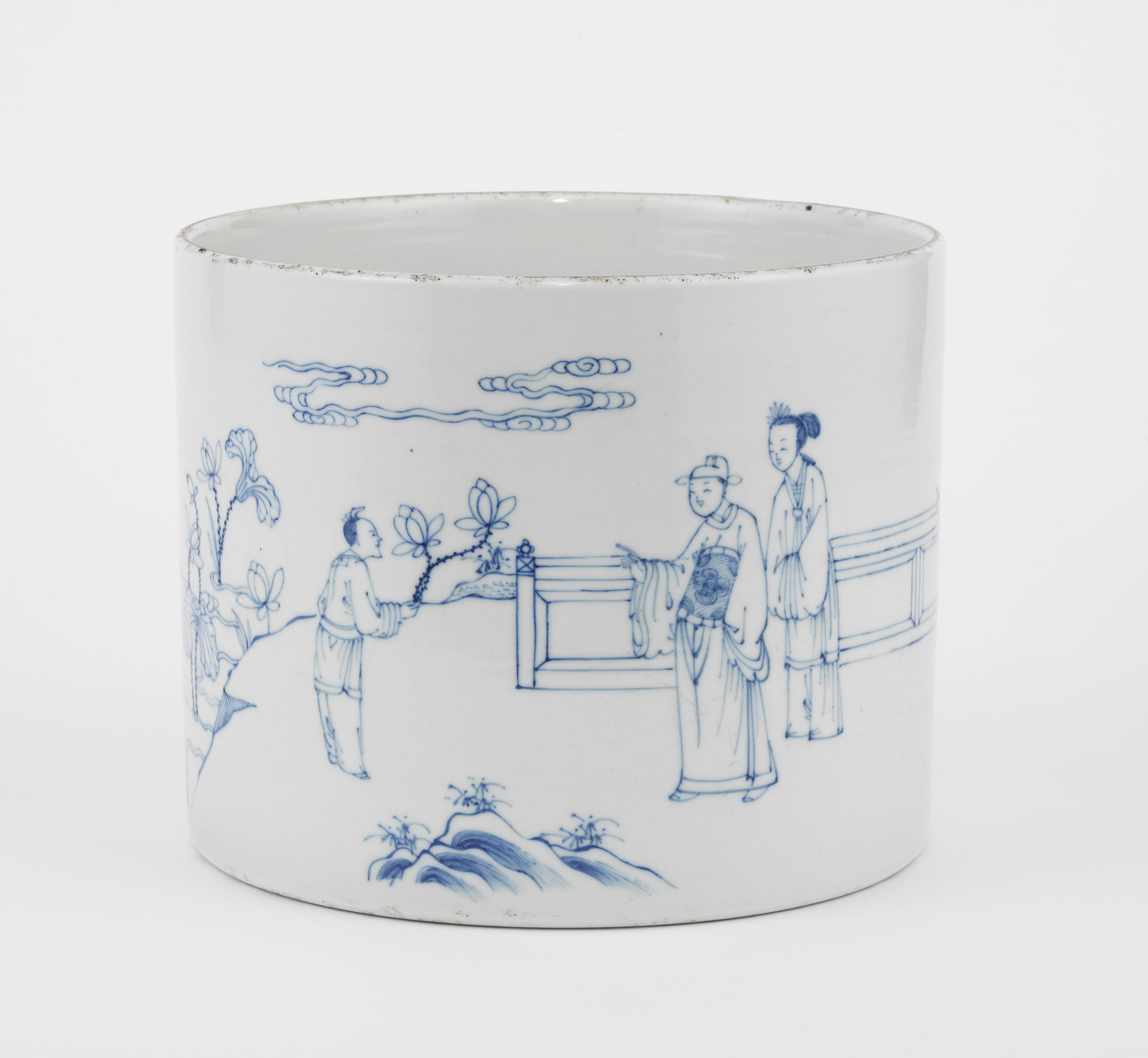 Porcelaine émaillée bleu blanc à motif de personnages dans un jardin, D 18,5 cm
