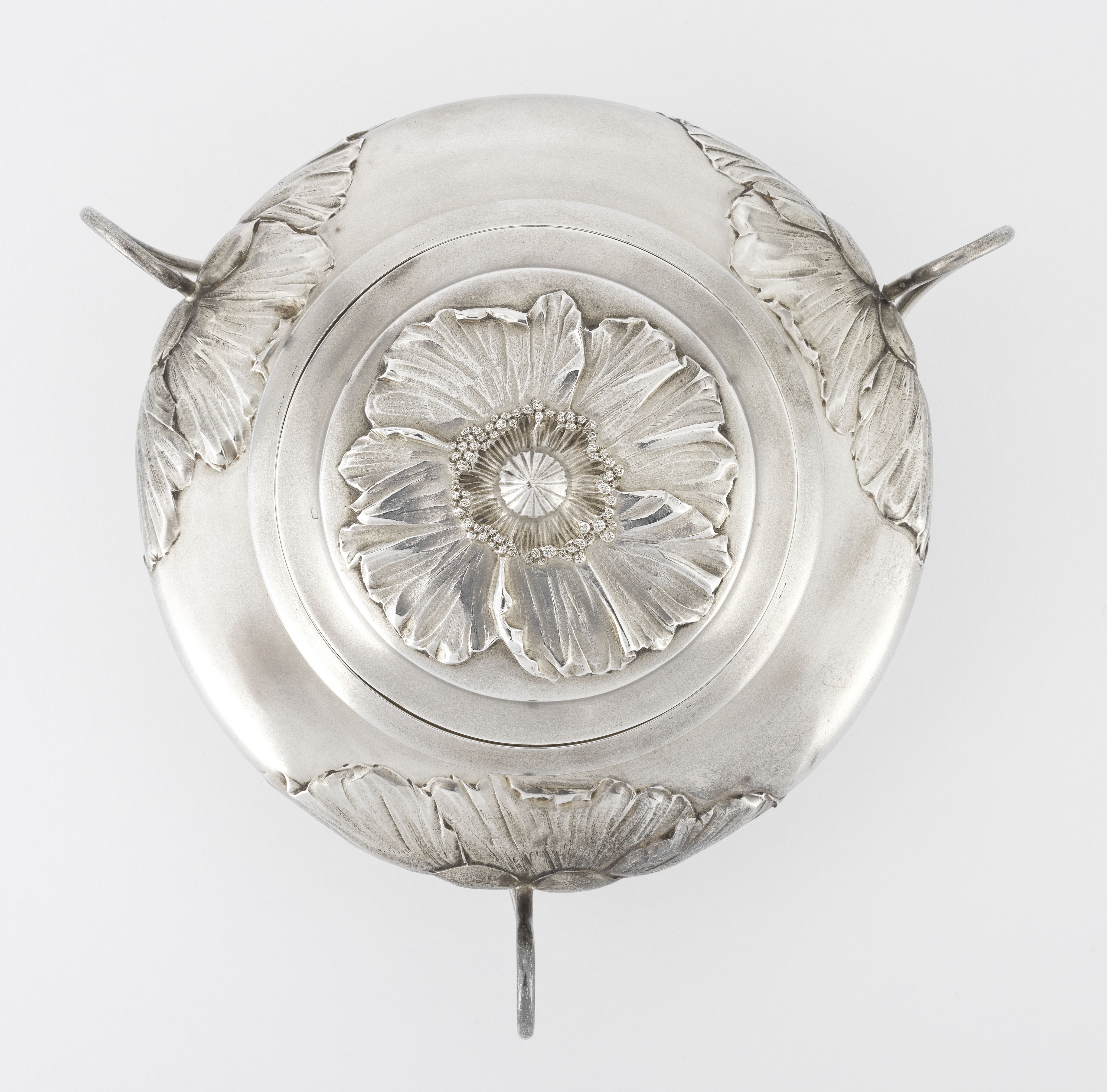 5451. Boîte ronde Art nouveau à trois anses et décor repoussé de pavots
