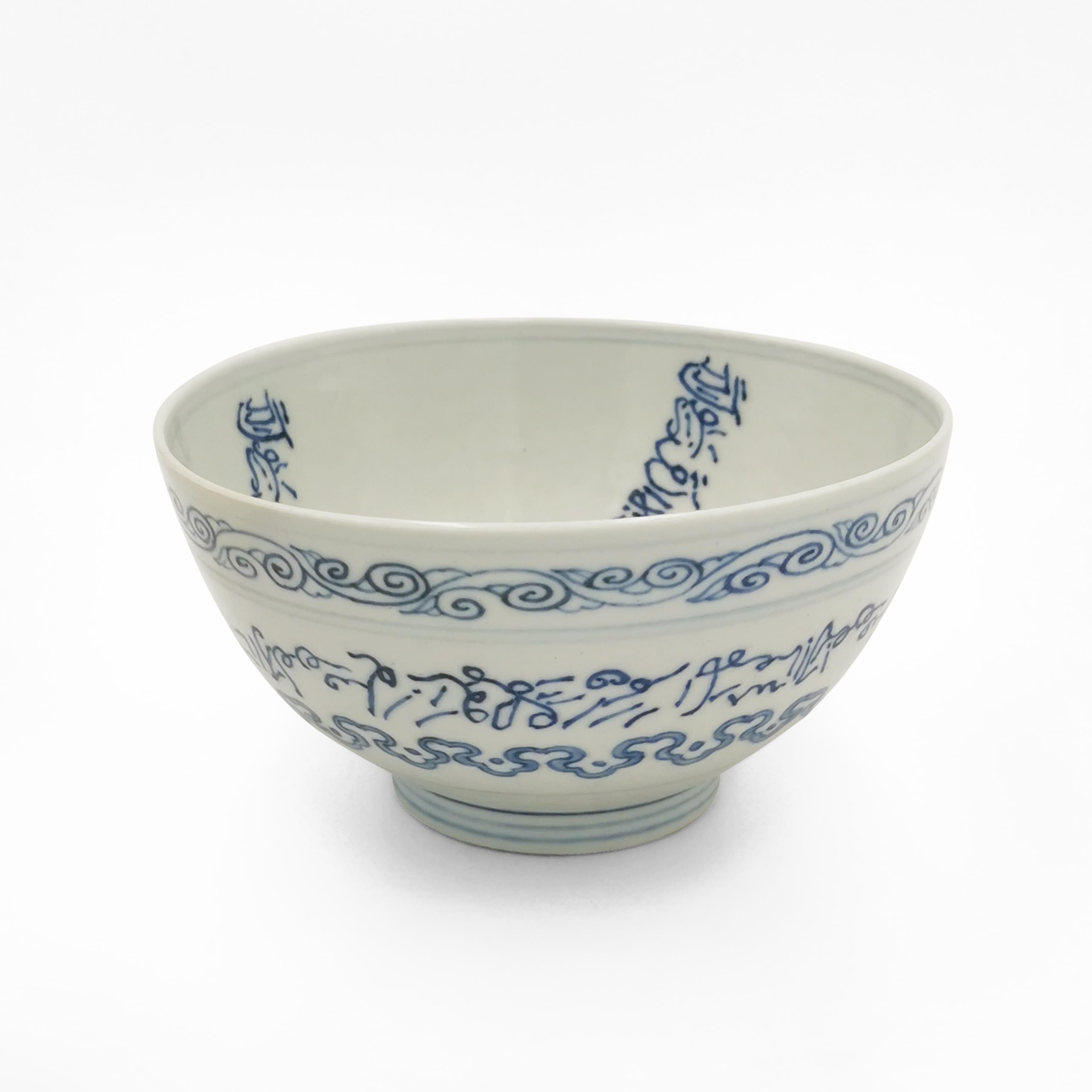 Porcelaine émaillée bleu blanc à motif de calligraphie arabe, D 13,5 cm