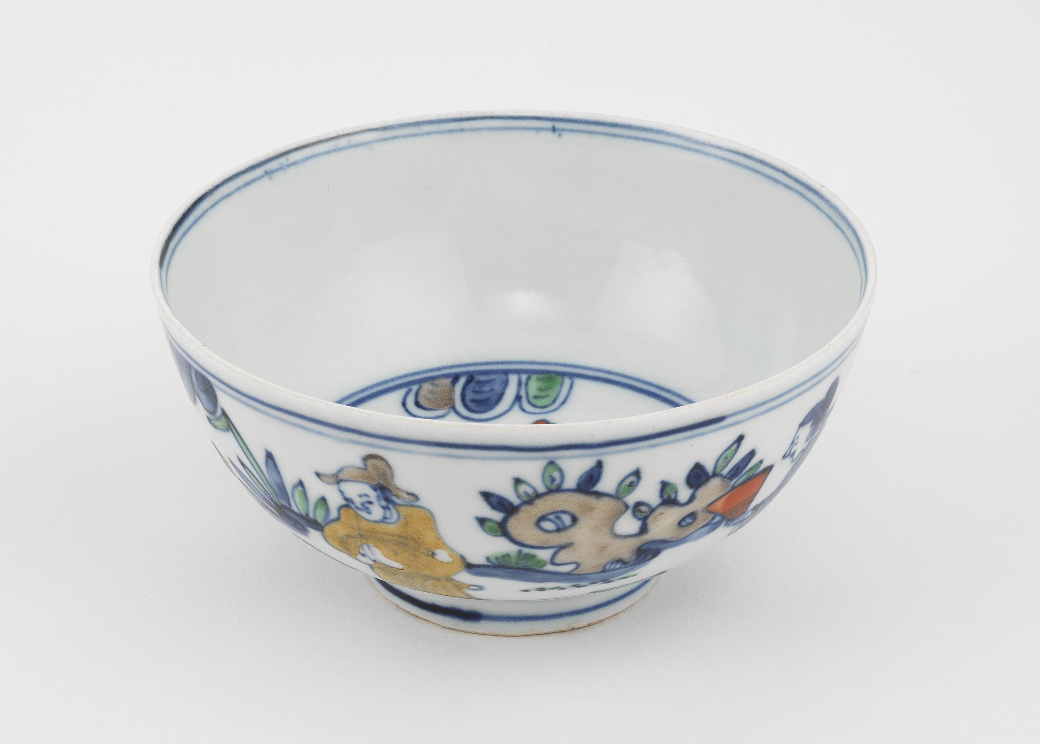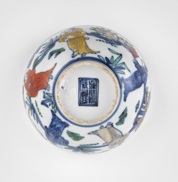 Porcelaine émaillée doucai à motif de personnages, marque sous la base, D 14 cm