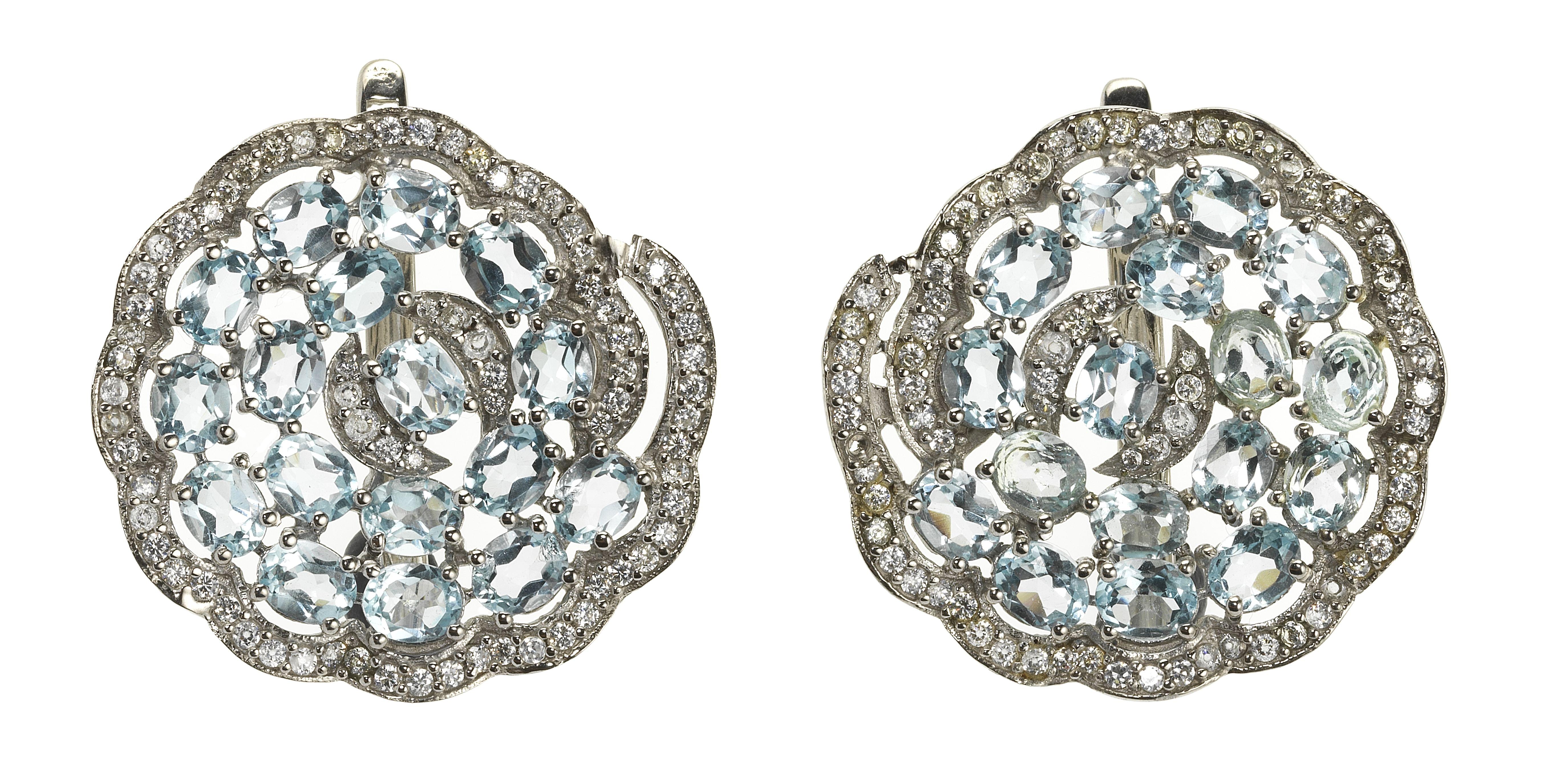 Pavées de topazes bleues rehaussées de pierres d'imitation pour le diamant, argent 925, D env. 3 cm. Pour les lots précédés d'un *, la TVA de 7,7% est due sur l'entier du prix d'adjudication.