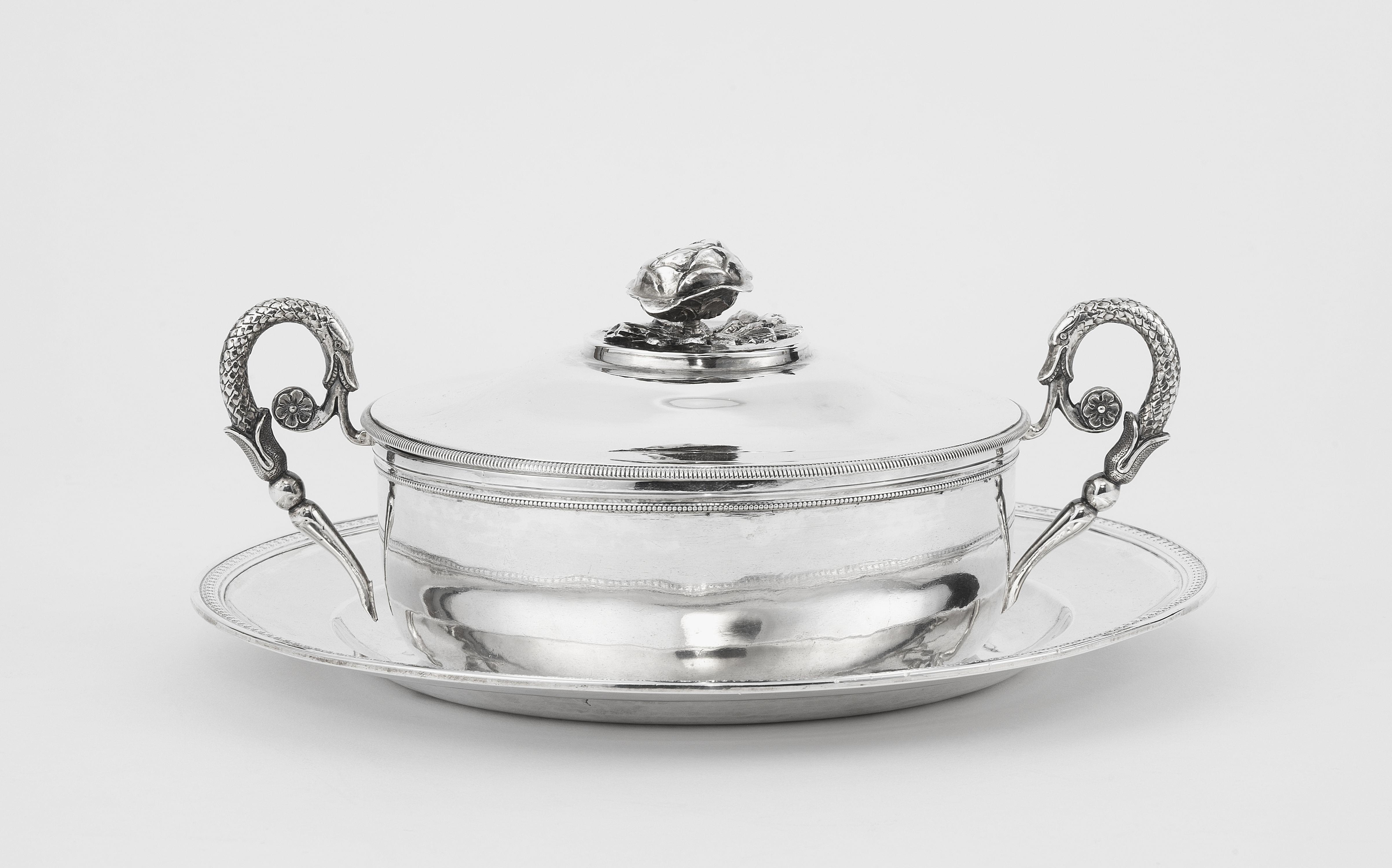 208. Bouillon couvert à oreilles volutes ajourées et gravé du cimier...