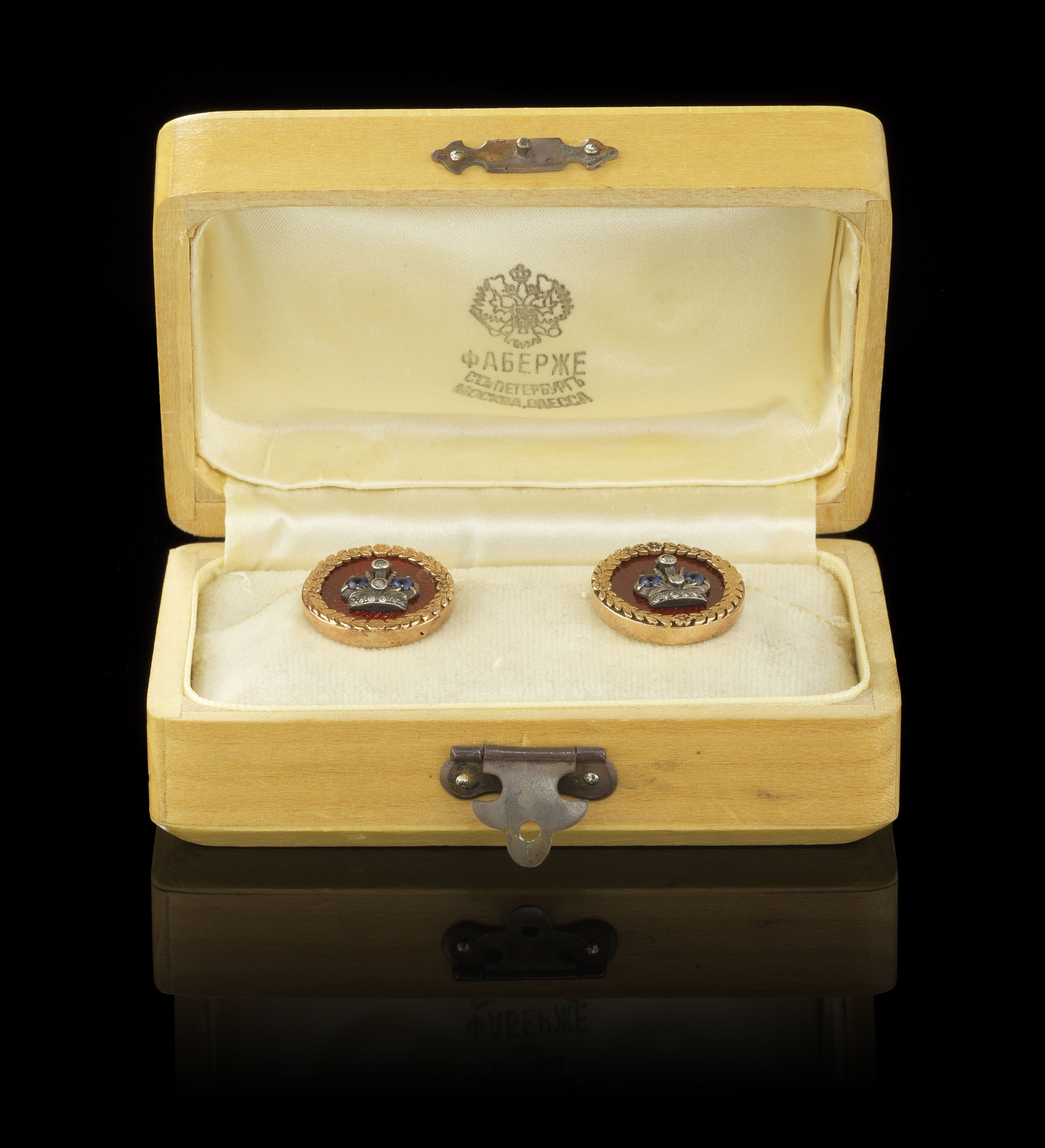 Porte des poinçons Fabergé, chef d'atelier August Frederik Hollming, or 56 zolotnik, émail rouge, saphirs taille cabochon et diamants, 19 g