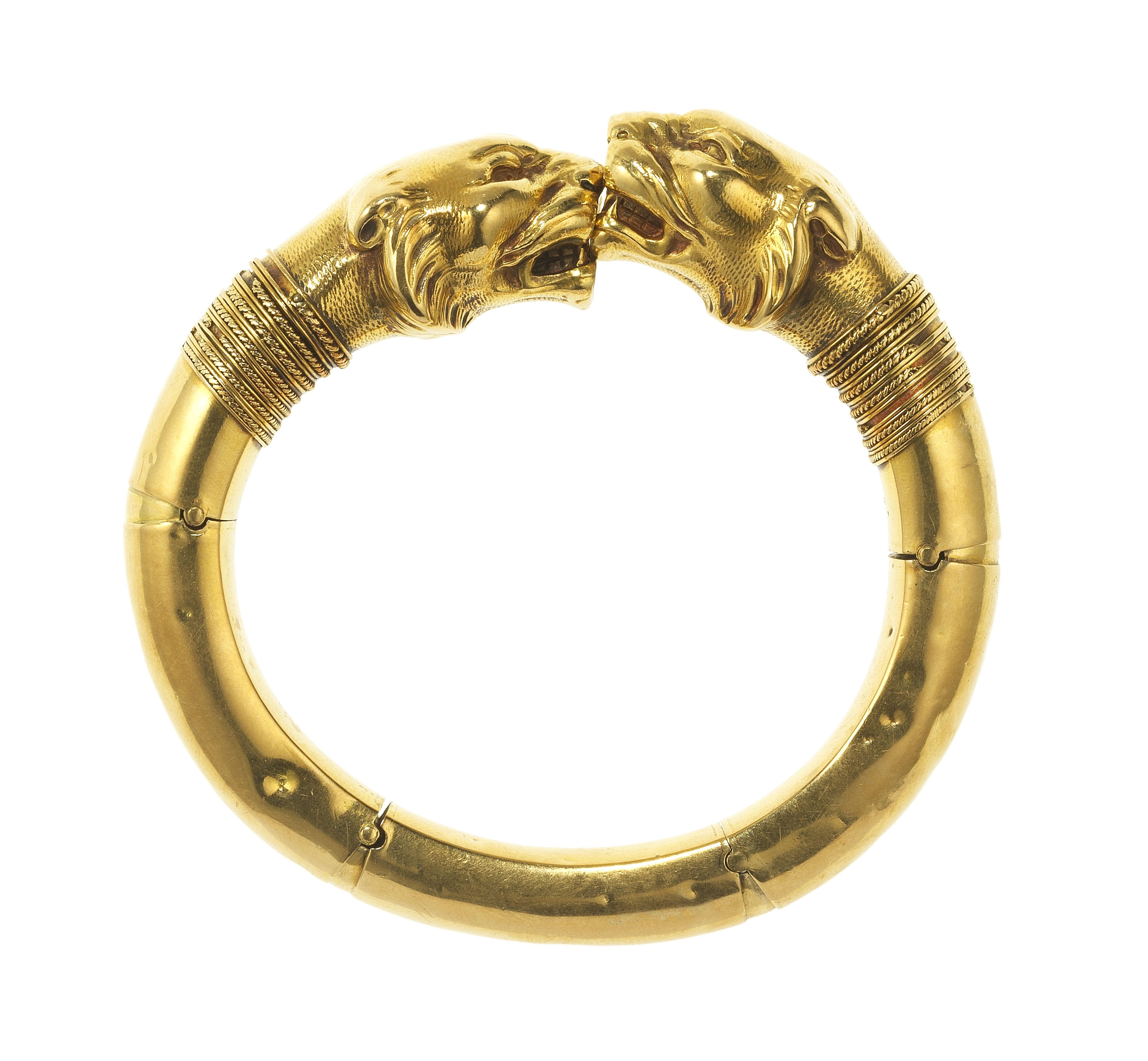 3591. Bracelet jonc ouvrant à motif de deux têtes de lions affrontées
