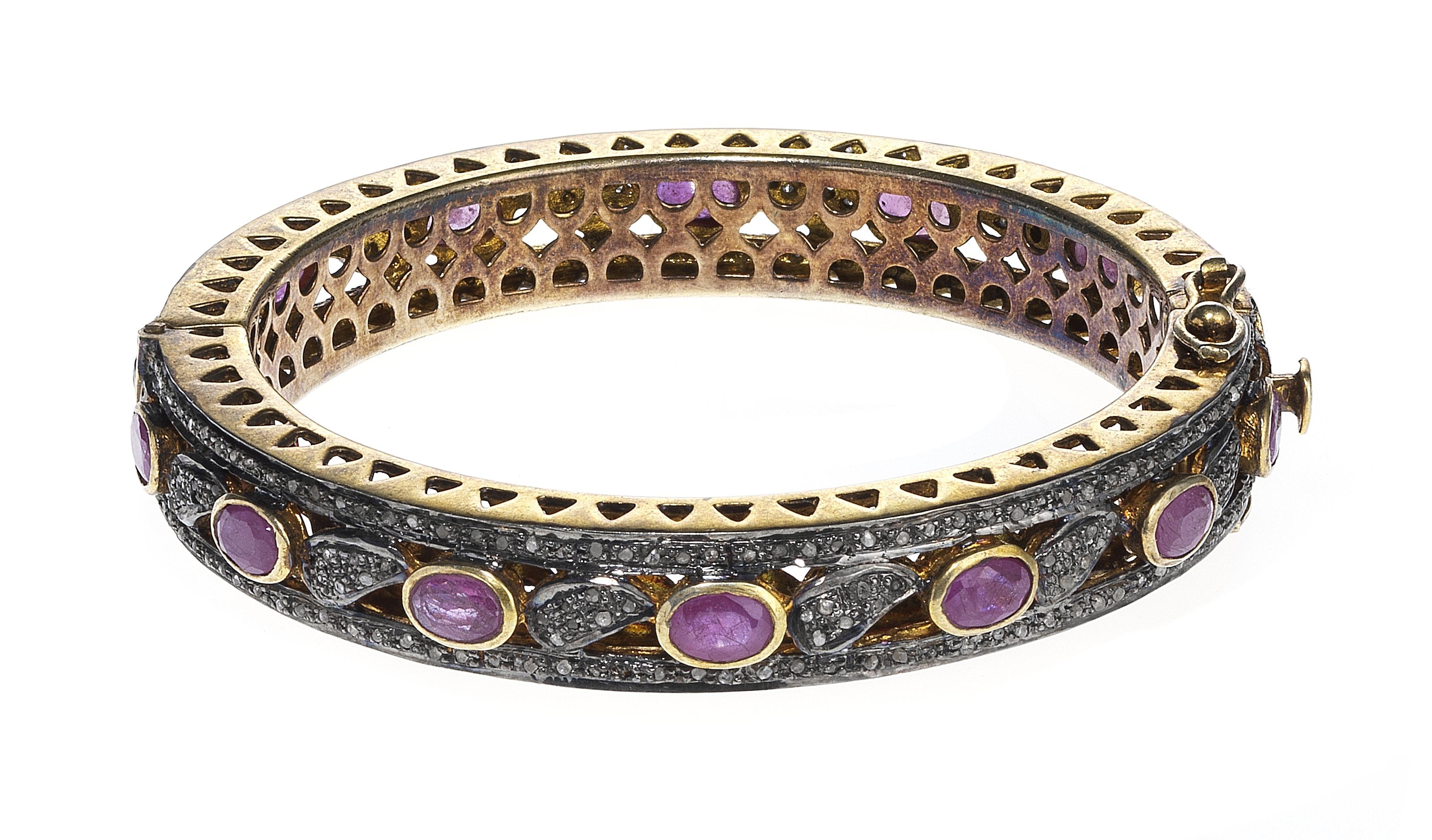 3183. *Bracelet jonc ouvrant ajouré serti de rubis taille ovale et pavé de roses de diamant