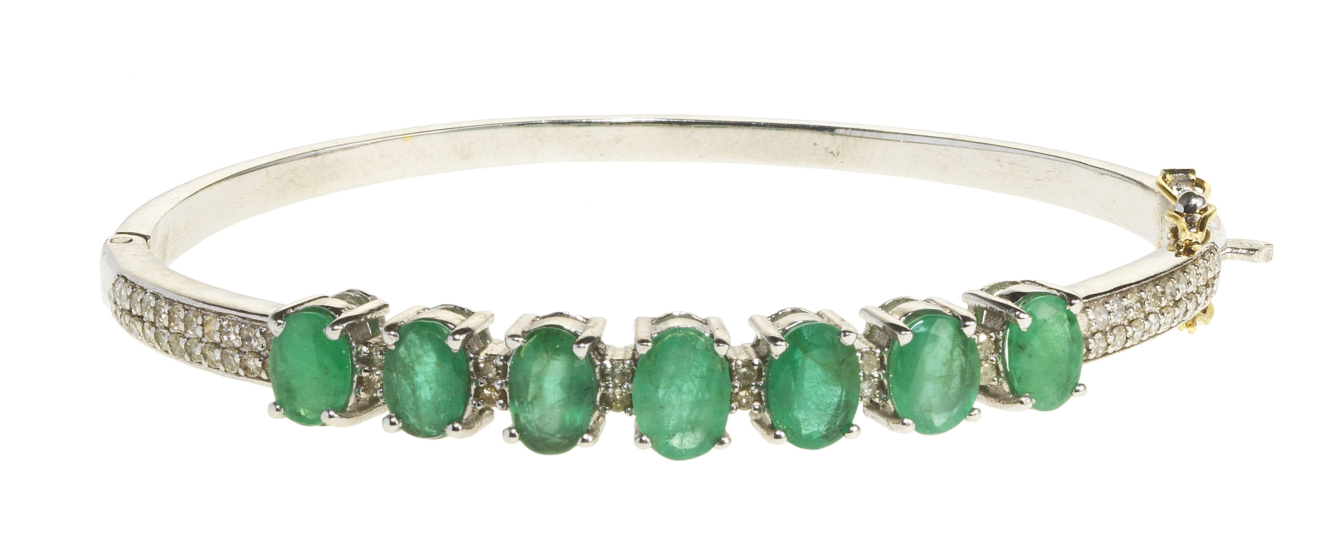 3129. *Bracelet jonc ouvrant serti d'une ligne d'émeraudes taille ovale (total env. 9 ct) et de diamants (total env. 0,5 ct)