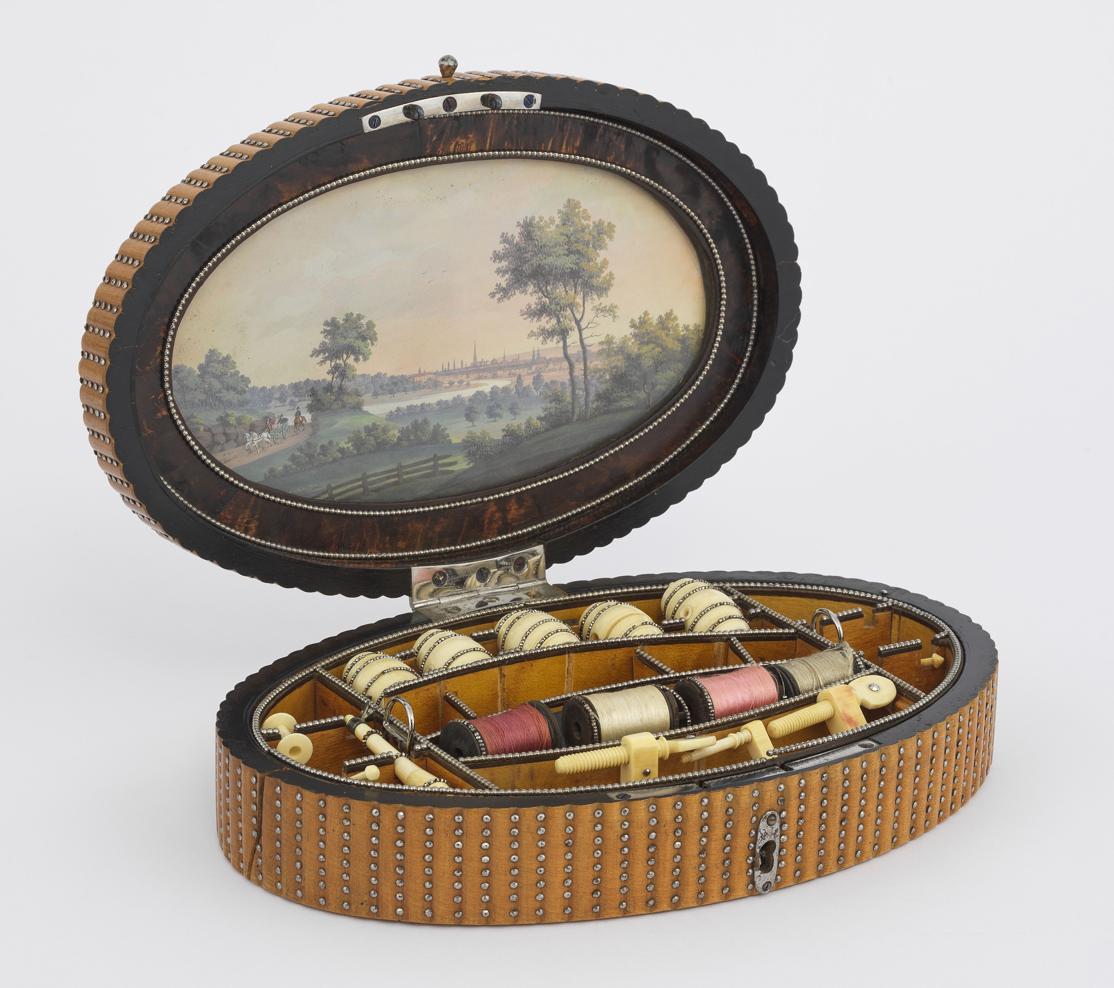 3829. Boîte à ouvrage à décor rayonnant entourant un panier fleuri ouv...