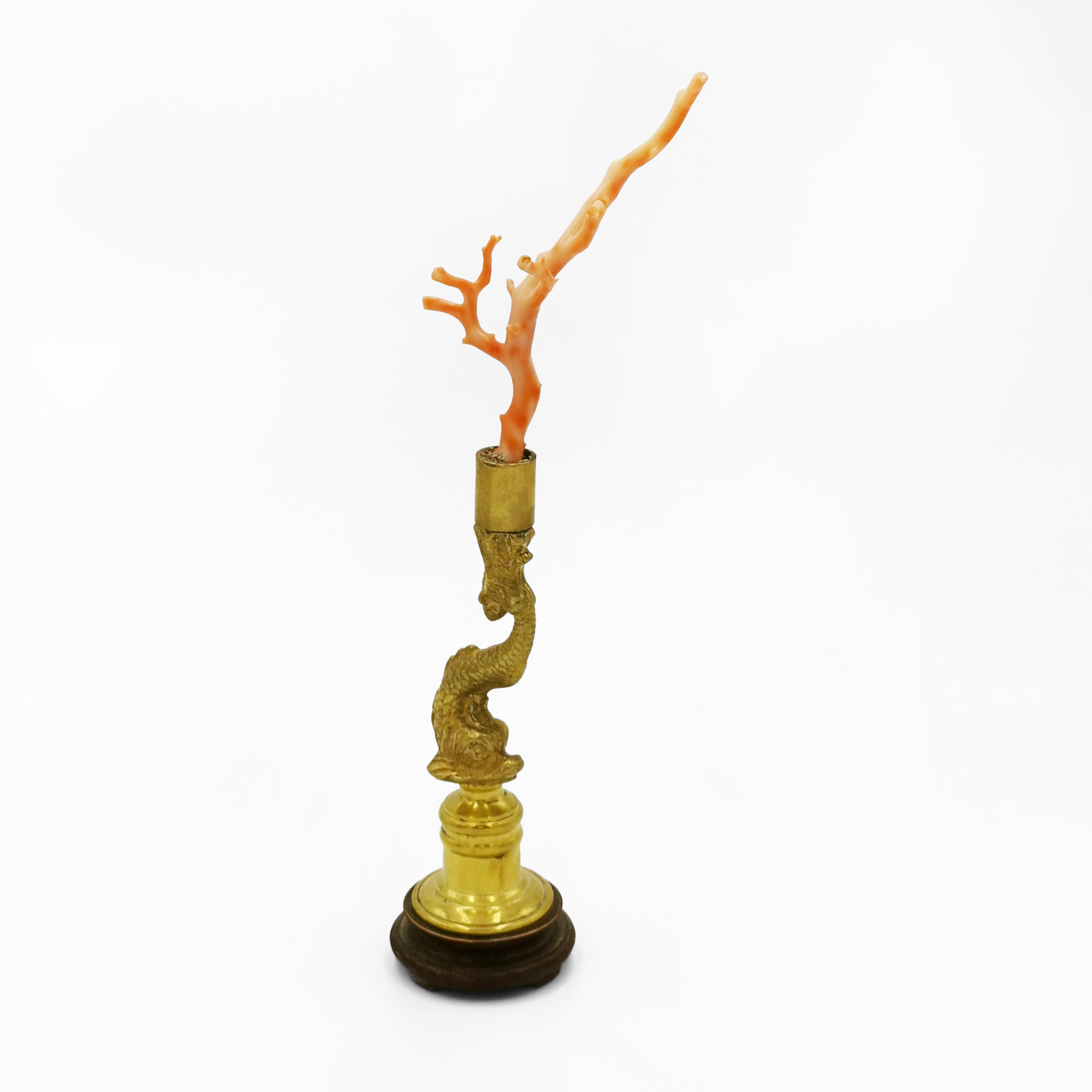 4312. Branche de corail rose montée sur une base en forme de dauphin