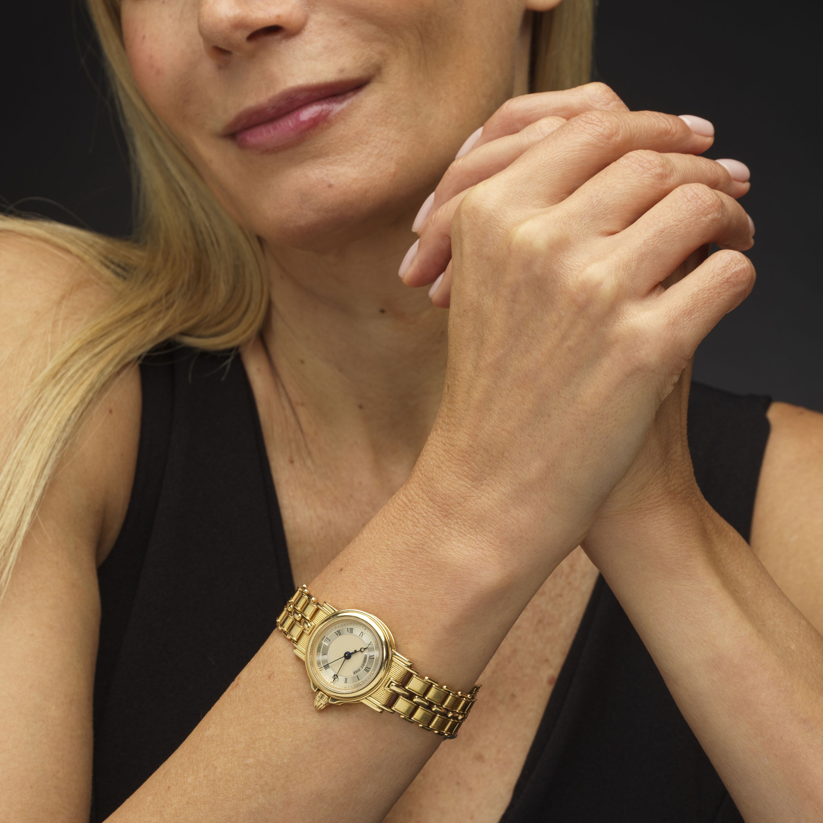 Cadran argenté guilloché, aiguilles bleuies, chiffres romains noirs, date à guichet à 6h, circa 1992, réf. 8400, or 750, D 25 mm, poids brut 90 g, avec livret de certificat d'origine et de garantie
