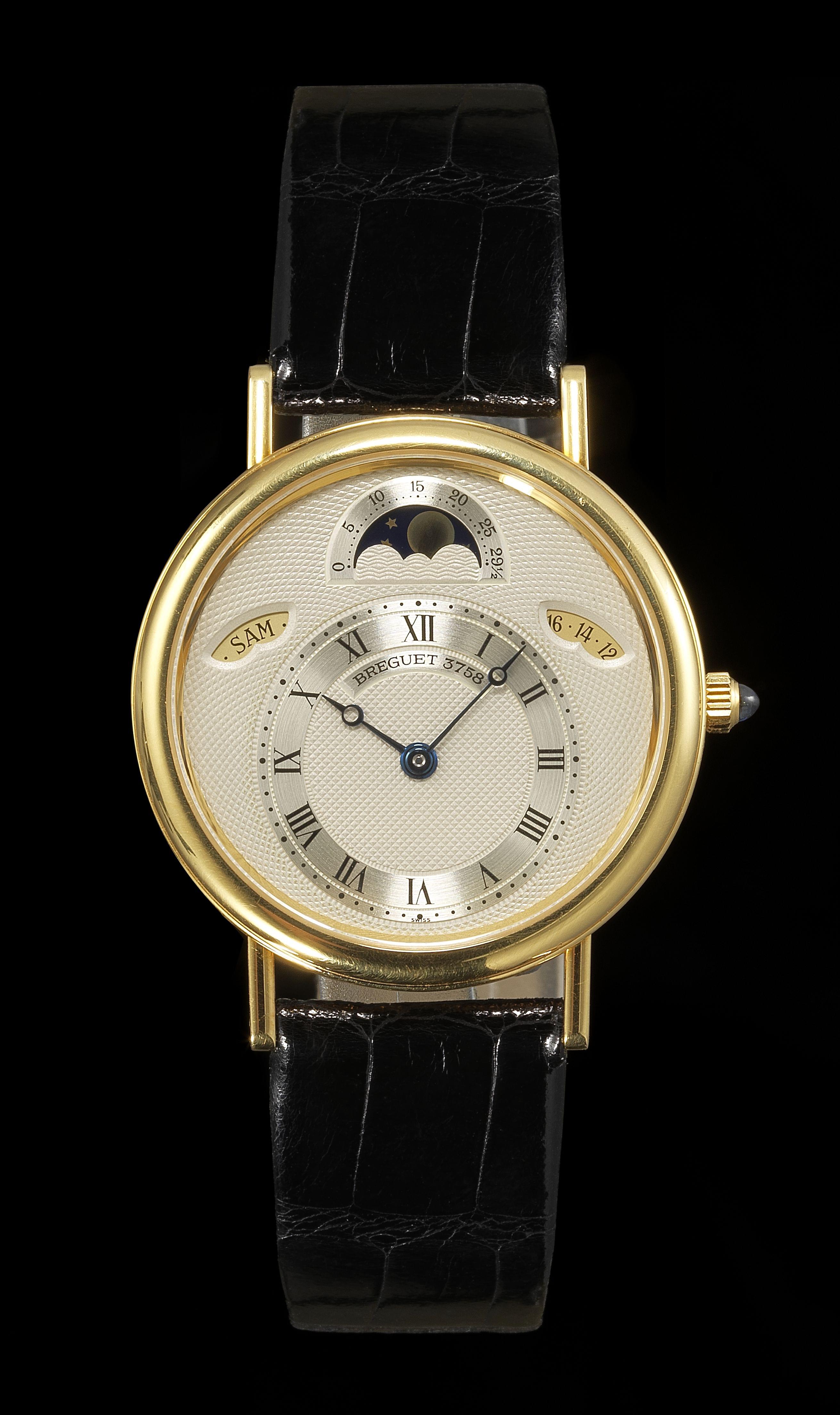Cadran guilloché argenté, aiguilles bleuies, chiffres romains noirs, date et jour à guichet à 2h et 10h, phases de Lune à 12h, réf. 3330, gravure au dos, or 750, D 35 mm, poids brut 56 g