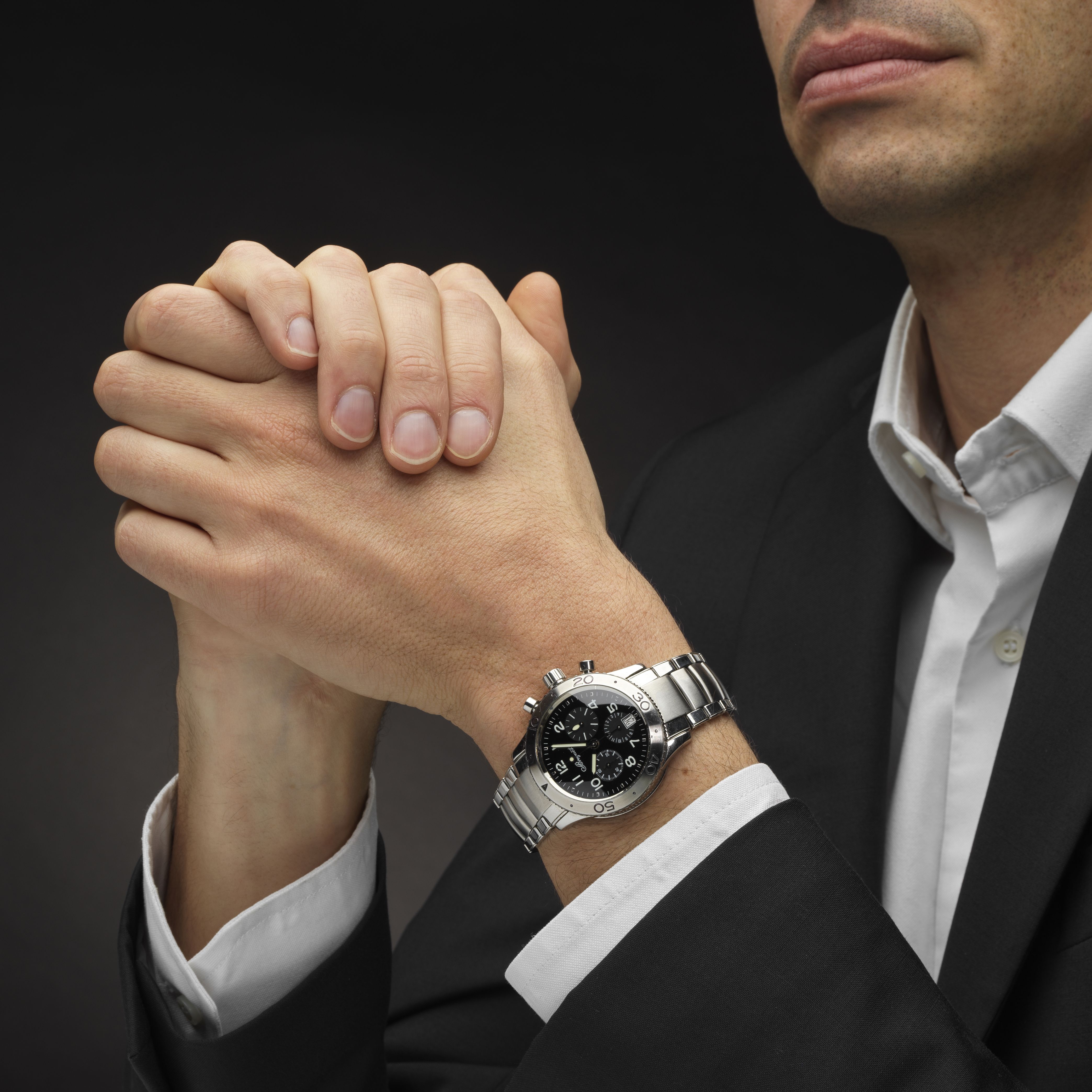 Cadran noir, chiffres arabes et aiguilles luminescents, date à guichet à 6h, deux cadrans pour le chrono, secondes à 9h, réf. 3820, acier, D 39 mm