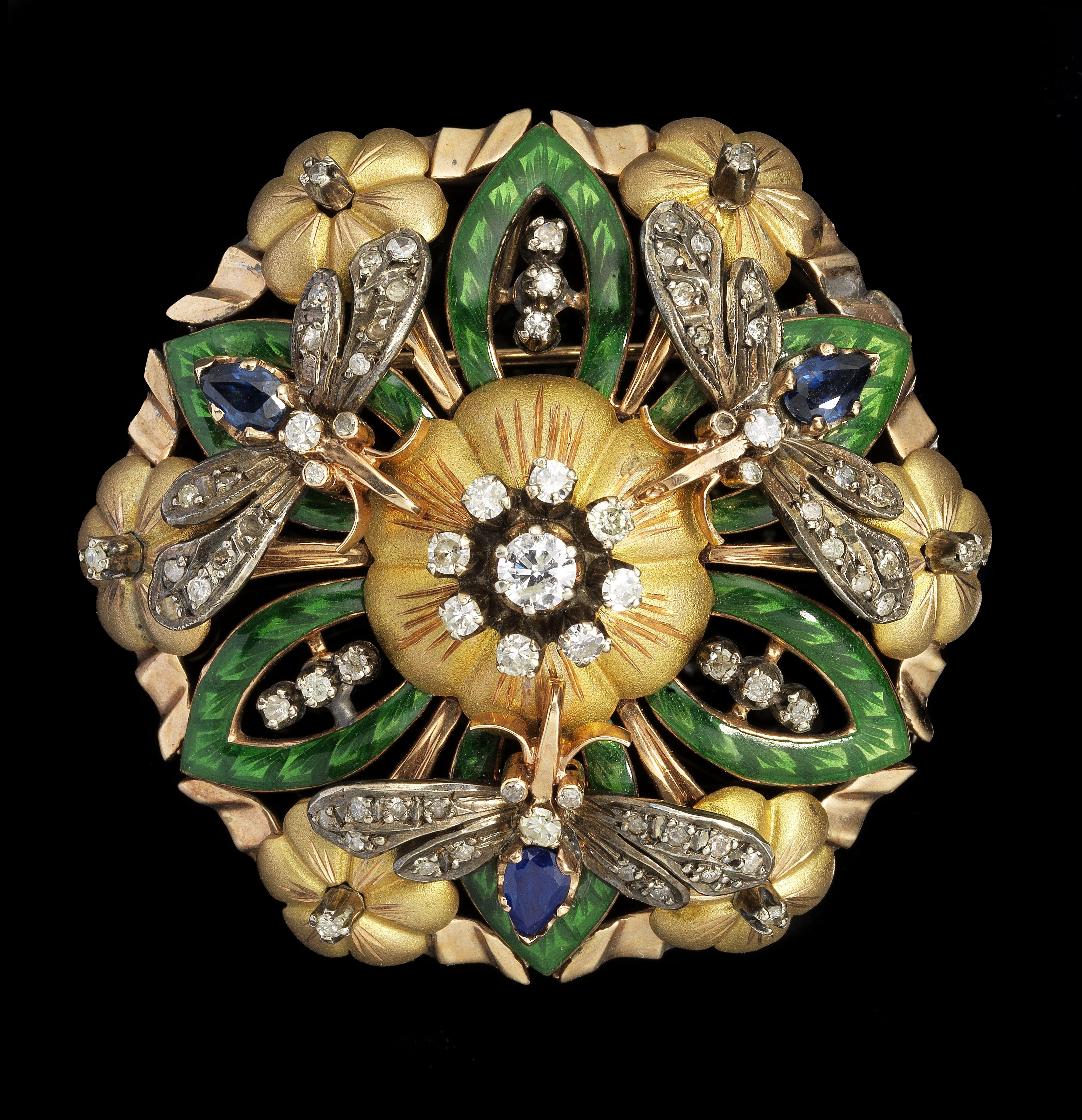 Centrée d'un diamant (env. 0,2 ct) entouré de diamants taille 8/8 et ornée de trois motifs de papillons aux corps sertis de saphirs et aux ailes pavées de roses de diamants, travail ancien, or 585 et argent, D env. 5 cm, poids brut 31 g. Pour les lots précédés d'un *, la TVA de 7,7% est due sur l'entier du prix d'adjudication.