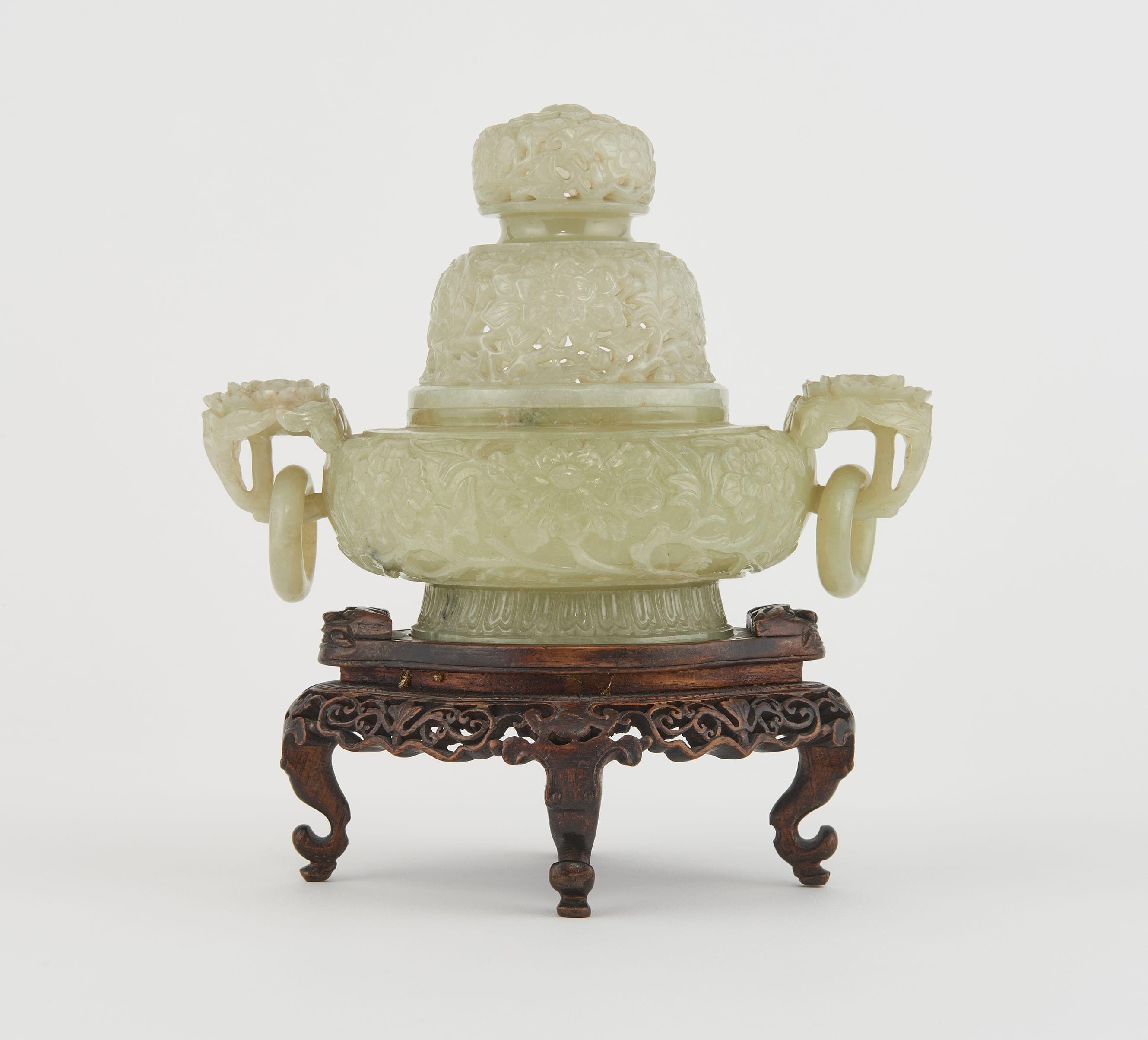 Jade sculpté et ajouré de fleurs, 16x43x8 cm