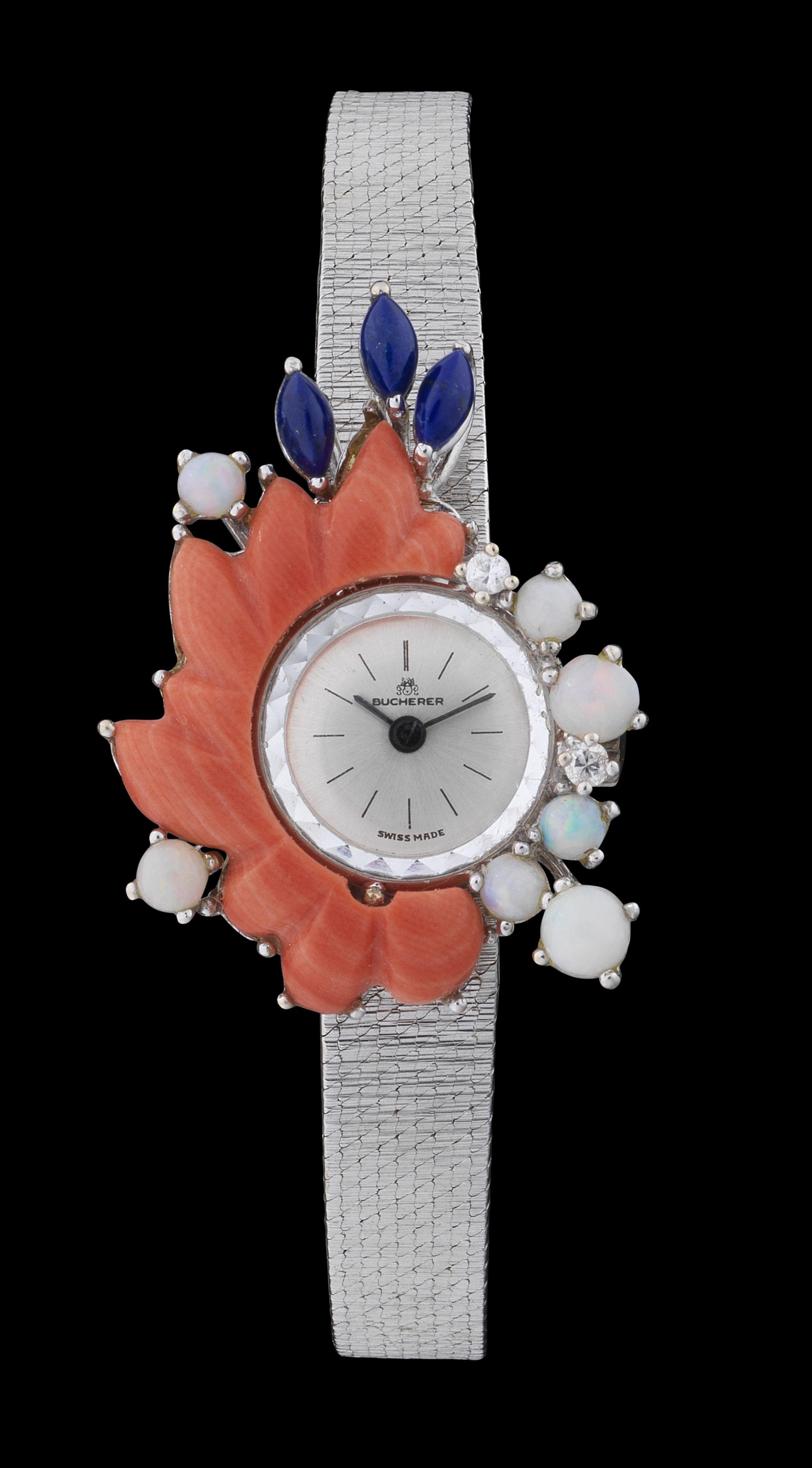 3531. Bücherer, montre-bracelet ronde mécanique sertie de corail, d'opales et de lapis-lazuli
