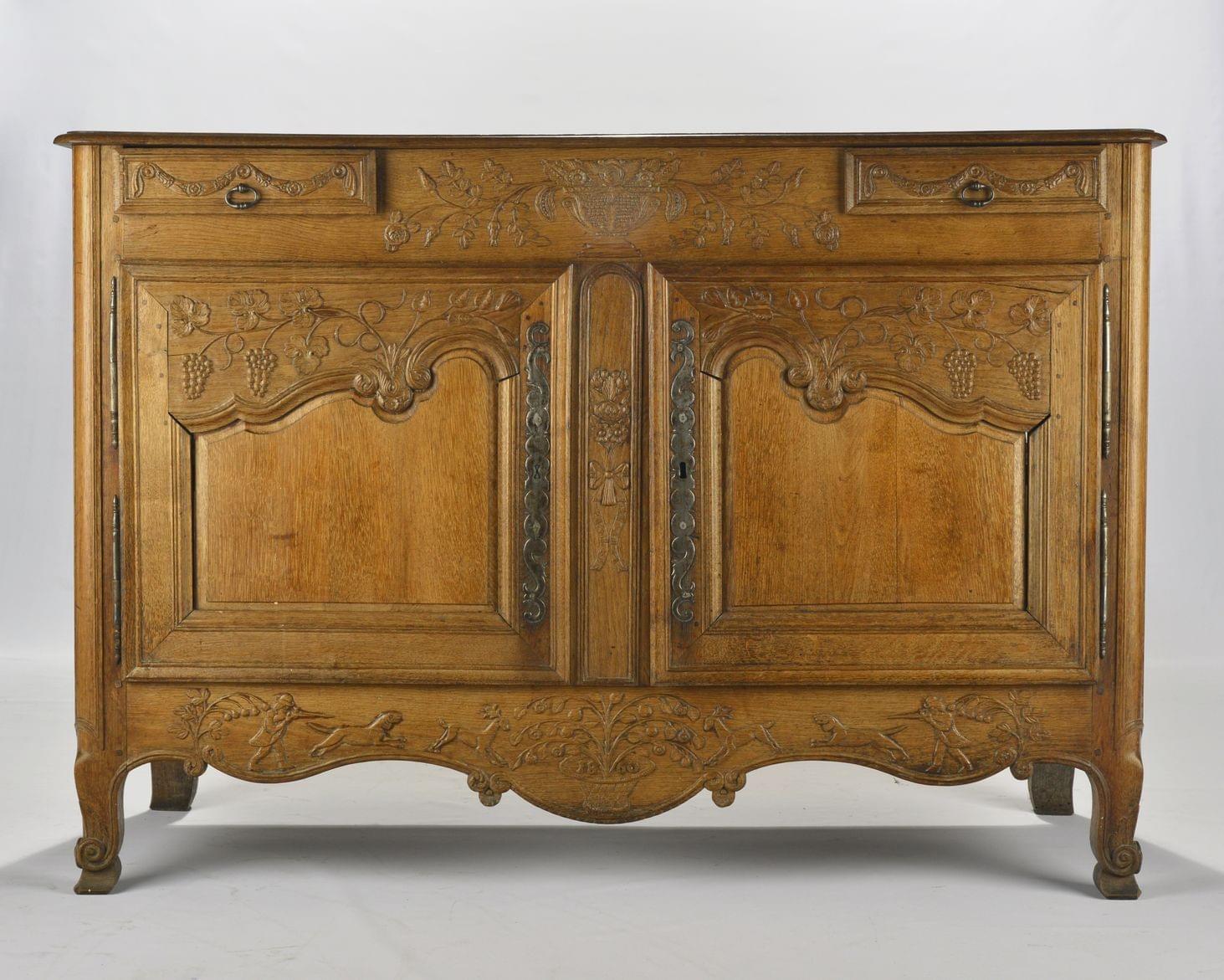 Chêne mouluré et sculpté à décor de scène de chasse, Sud de la France, 99x142x57 cm