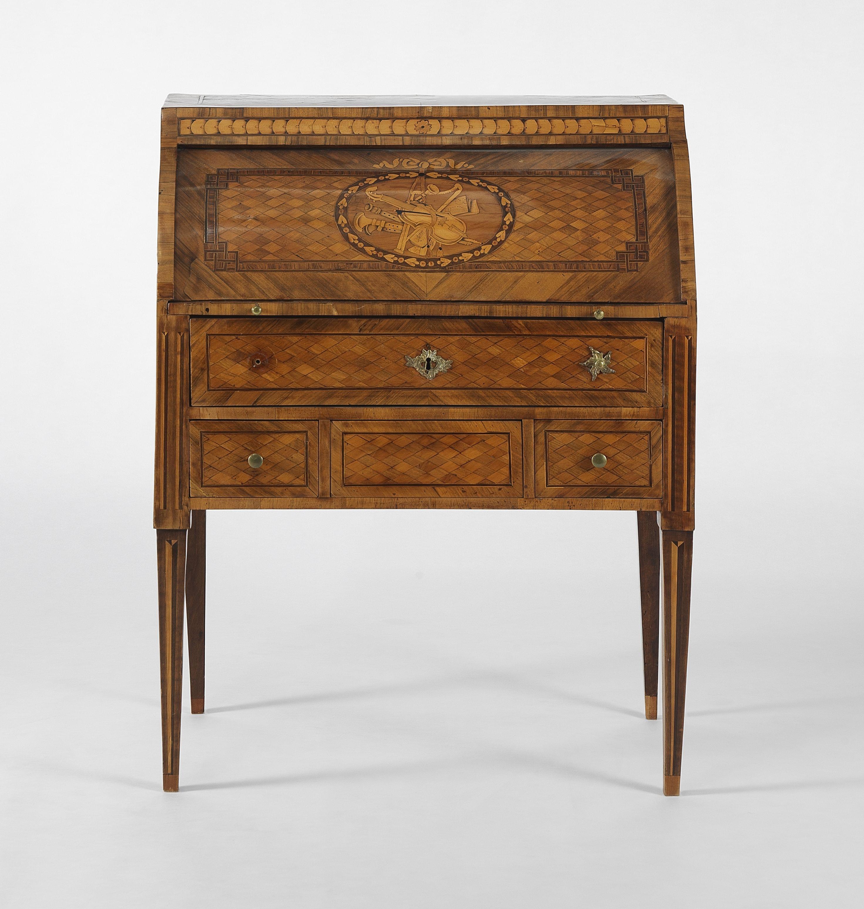 Bois marqueté à décor d'un trophée de musique, 104x81x50 cm