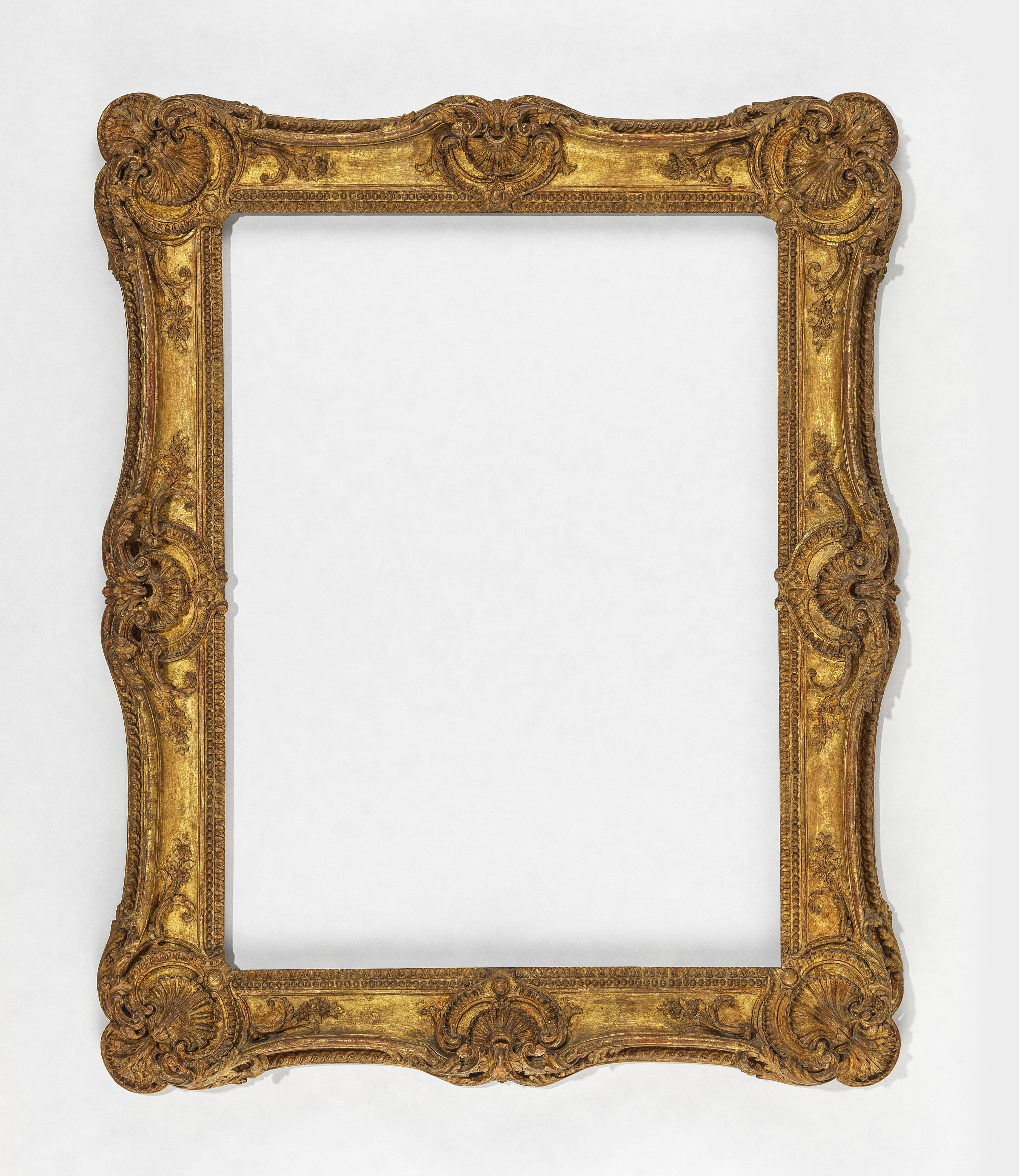 Bois sculpté doré, à motif de coquille, de feuilles d'acanthe, frise de perles et feuilles d'eau, 117x94 cm et à la vue 68,5x92 cm
