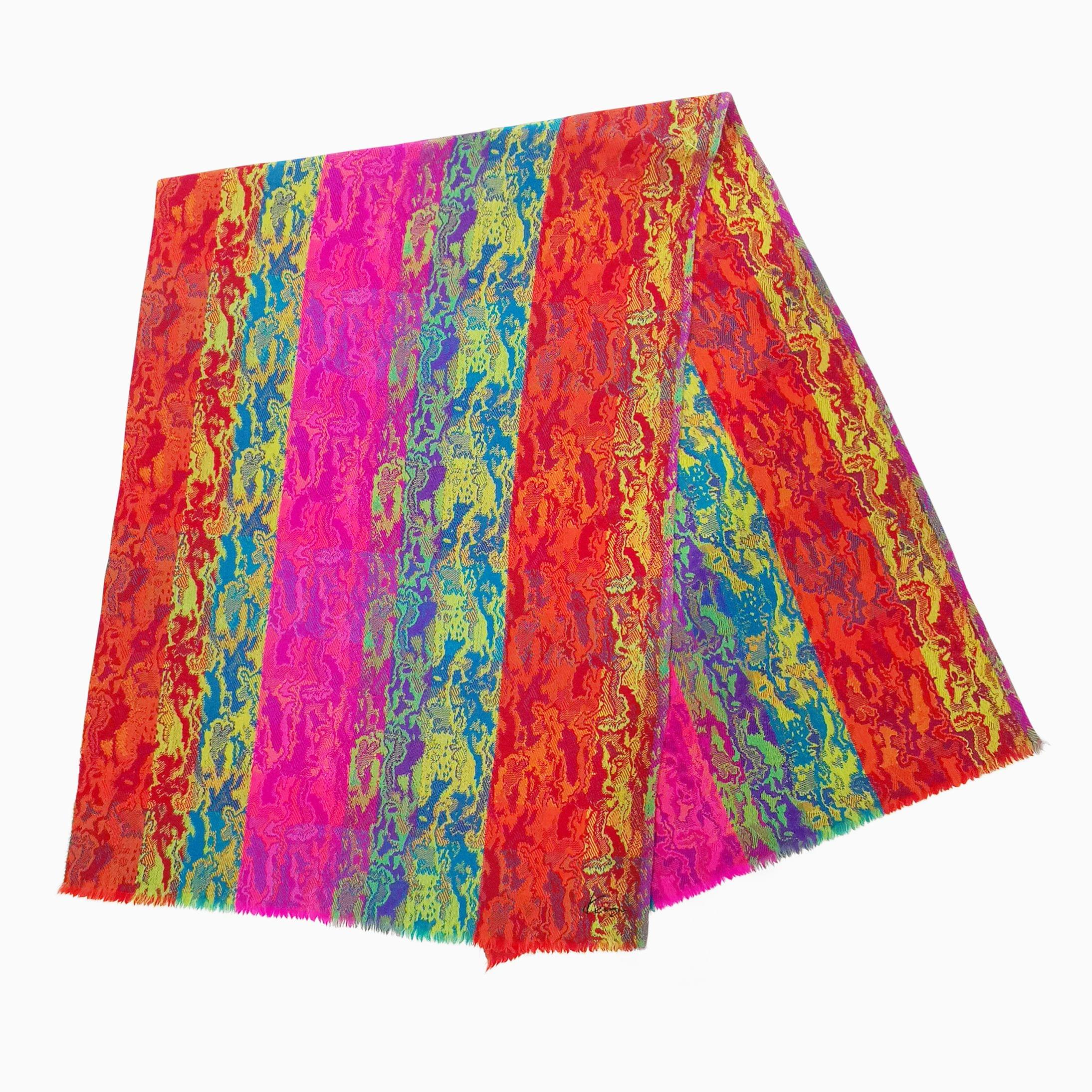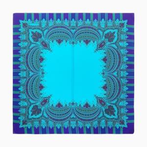 L'un à décor multicolore, l'autre en imprimé rose et bleu et le dernier à décor de rosace bleue, turquoise et verte, soie et laine,135x135 cm