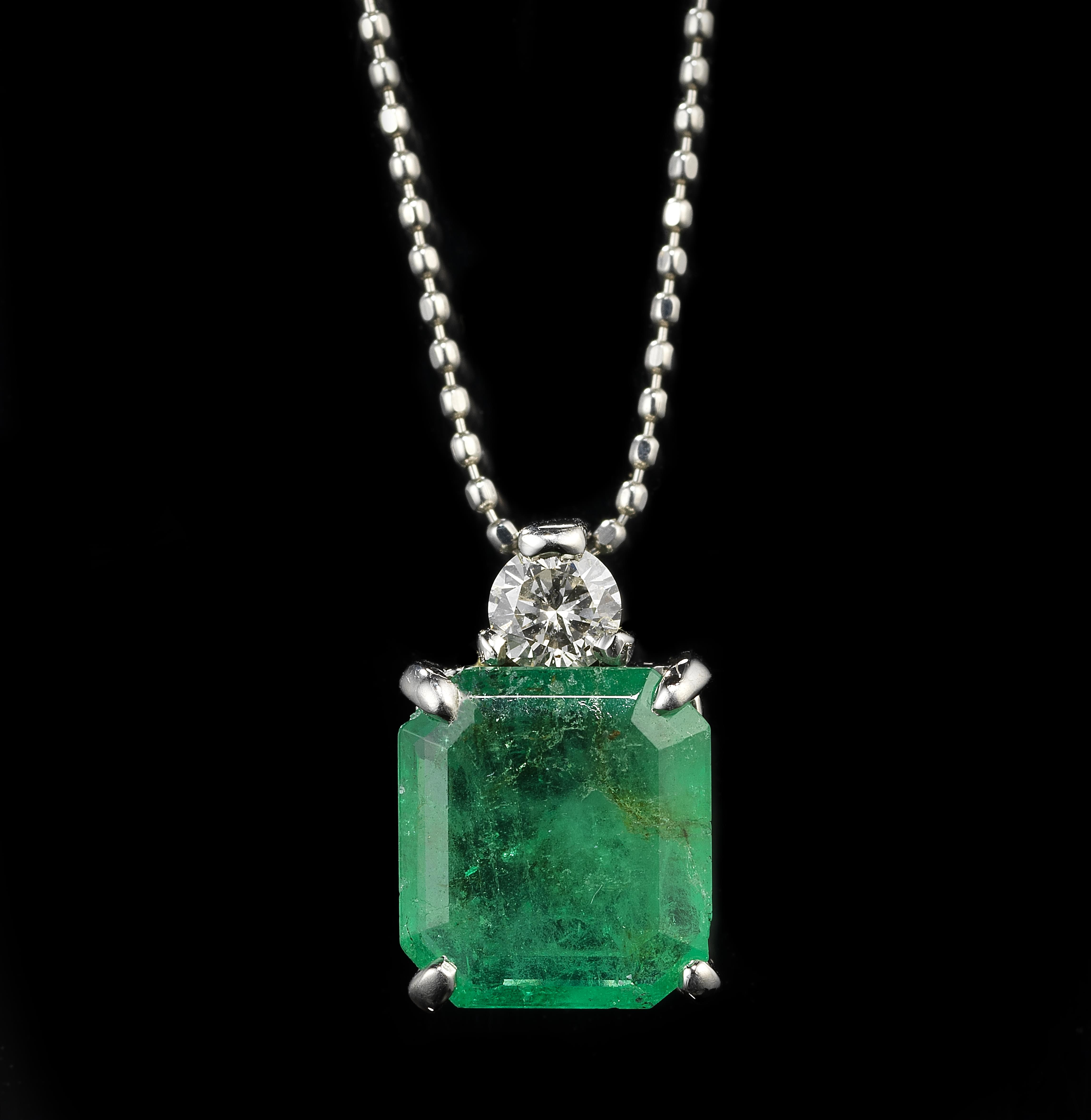 3513. *Chaîne à maille boule retenant un pendentif serti d'une émeraude colombienne octogonale (2,35 ct)