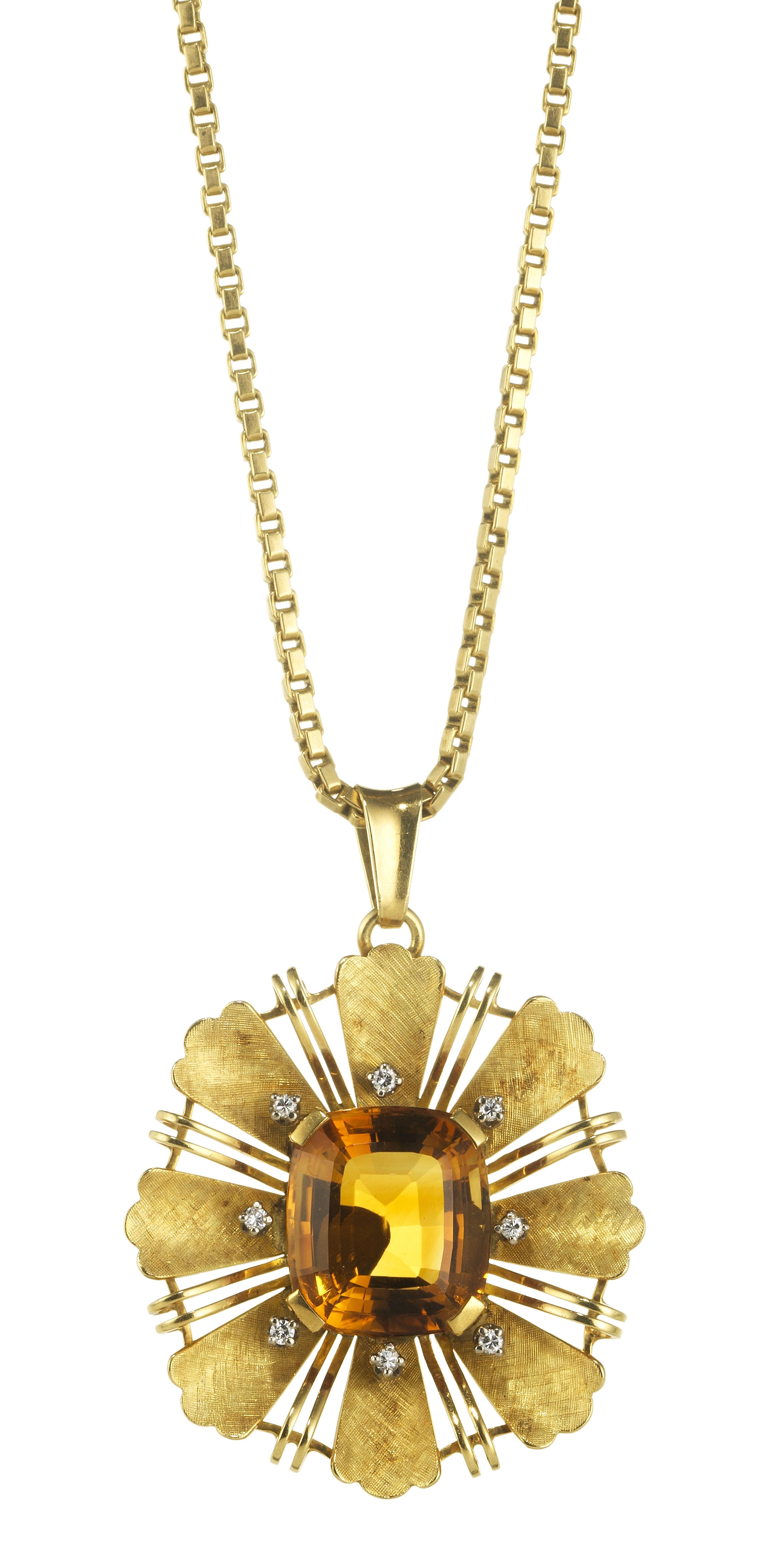 3498. Chaîne à maille vénitienne retenant un pendentif fleur centré d'une citrine entourée de diamants