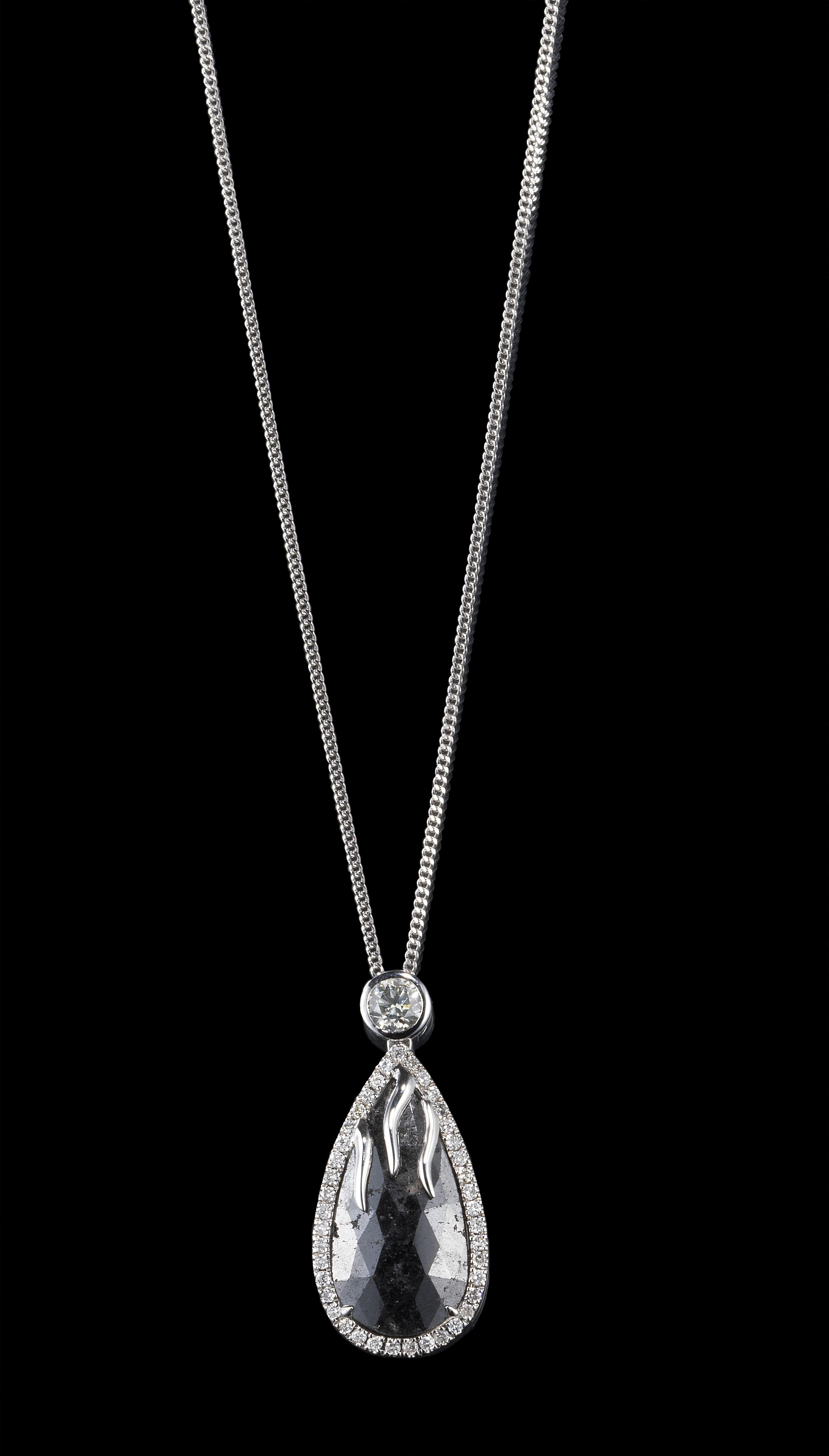 3394. *Chaîne retenant un pendentif serti d'un diamant noir taille poire facettée (9,31 ct) entouré de diamants (env. 0,6 ct) et rehaussé d'un