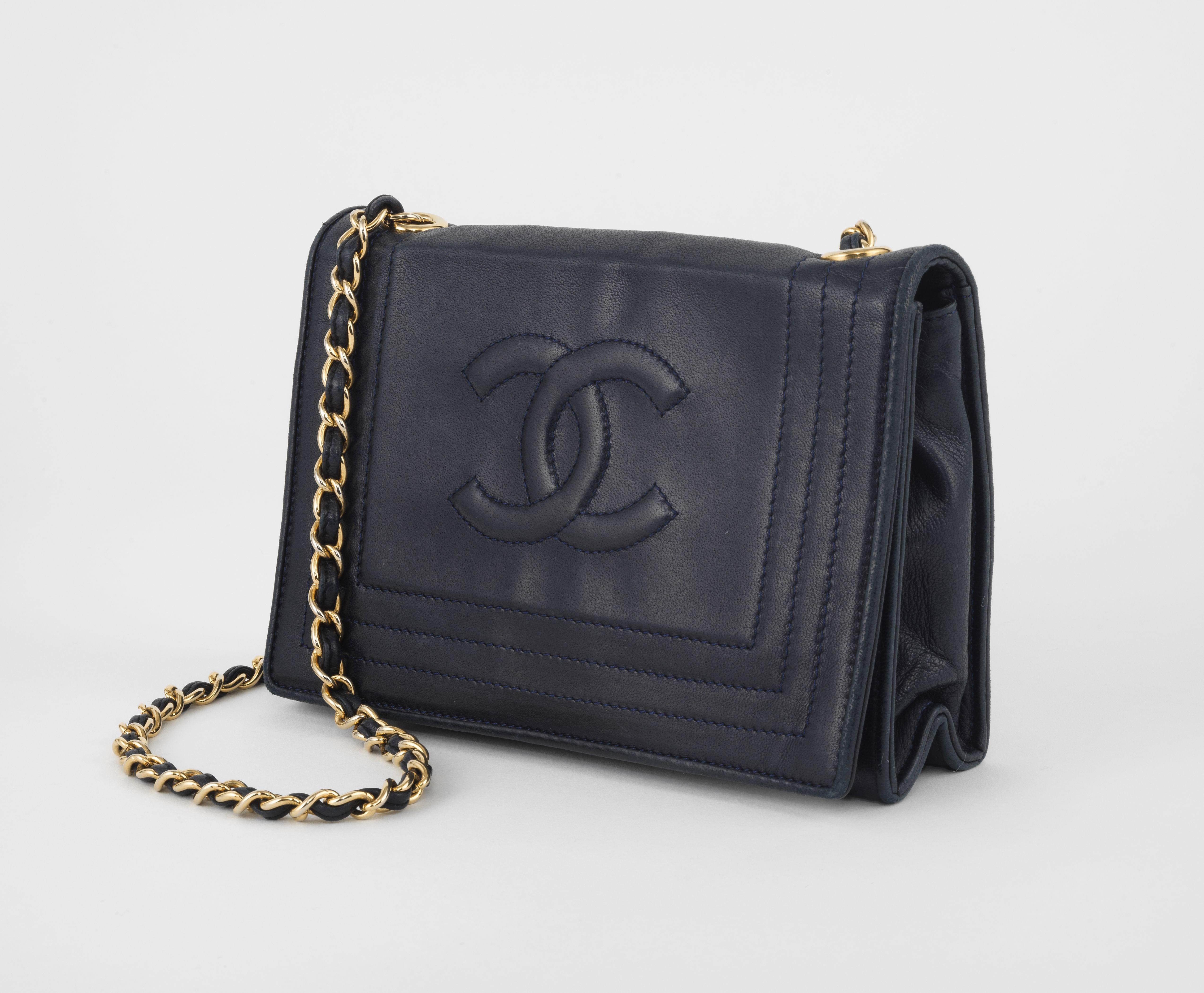Cuir bleu, rabat plaqué siglé à fermeture à bouton pression, anse en bandoulière, intérieur avec poche latérale zippée, garniture dorée, 20x13x5 cm
