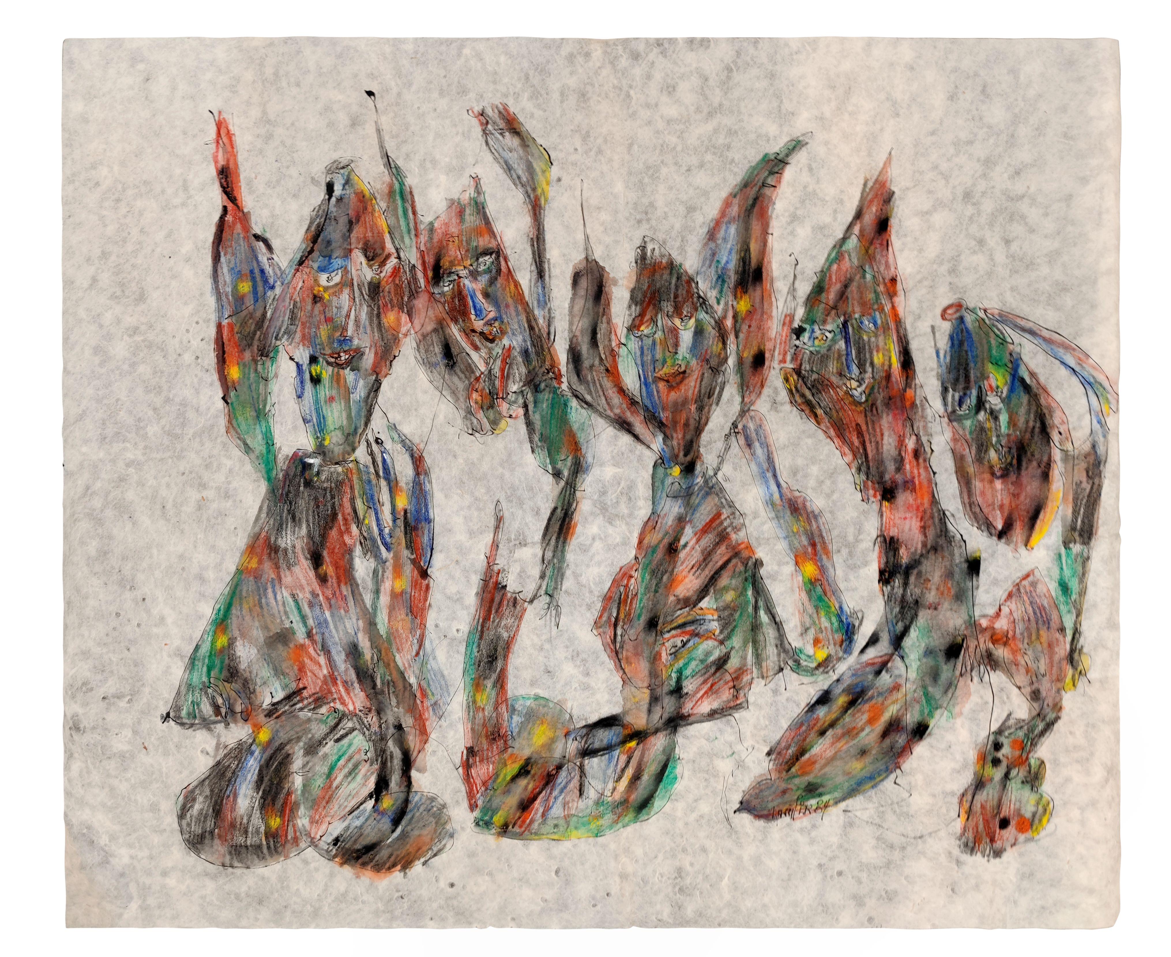Adoration, fusain, pastel et aquarelle sur papier, signé, 45x33...