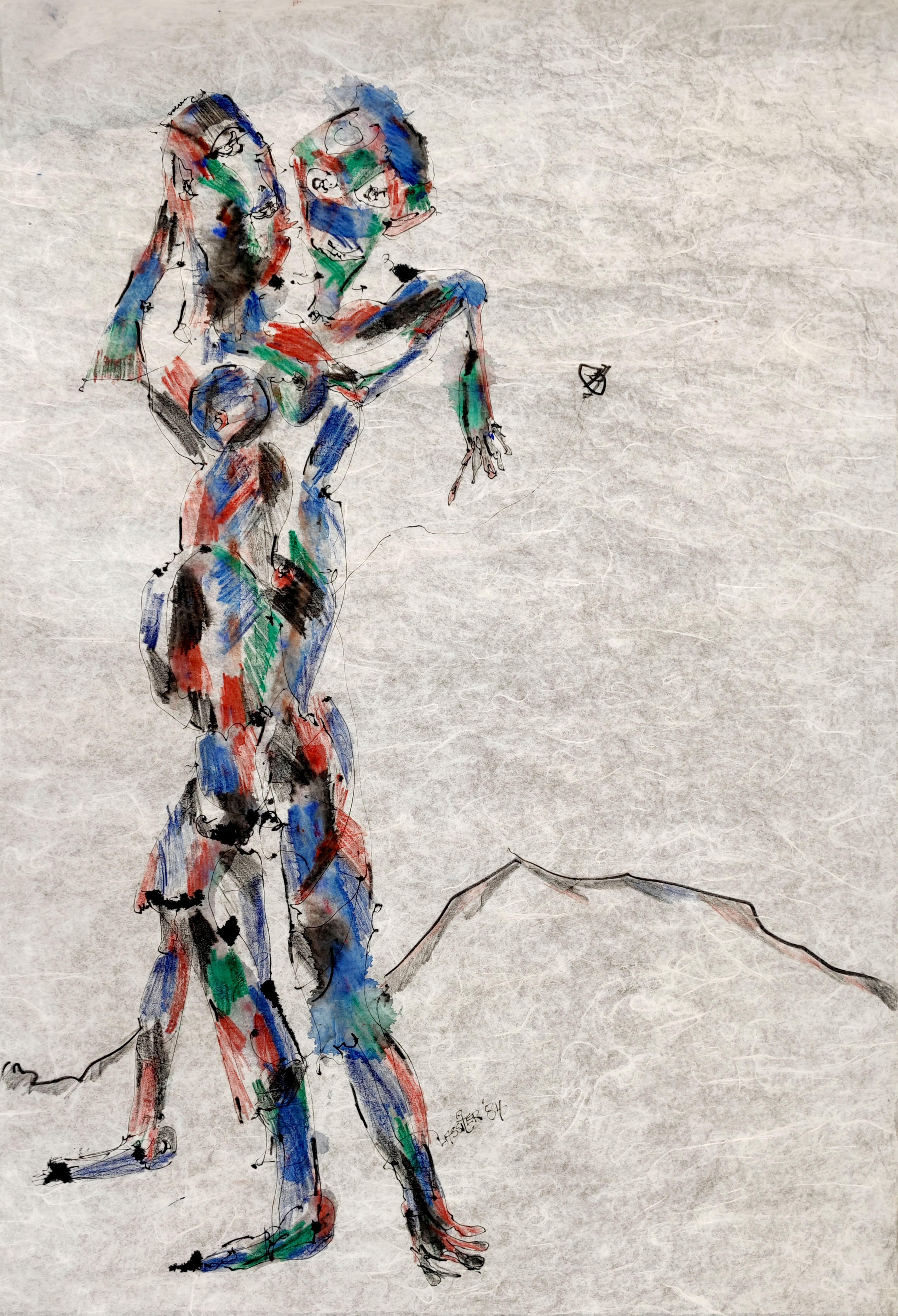 Silhouettes à deux têtes et trois jambes, encre et crayon sur papier, signé et daté 84, 90x60 cm
