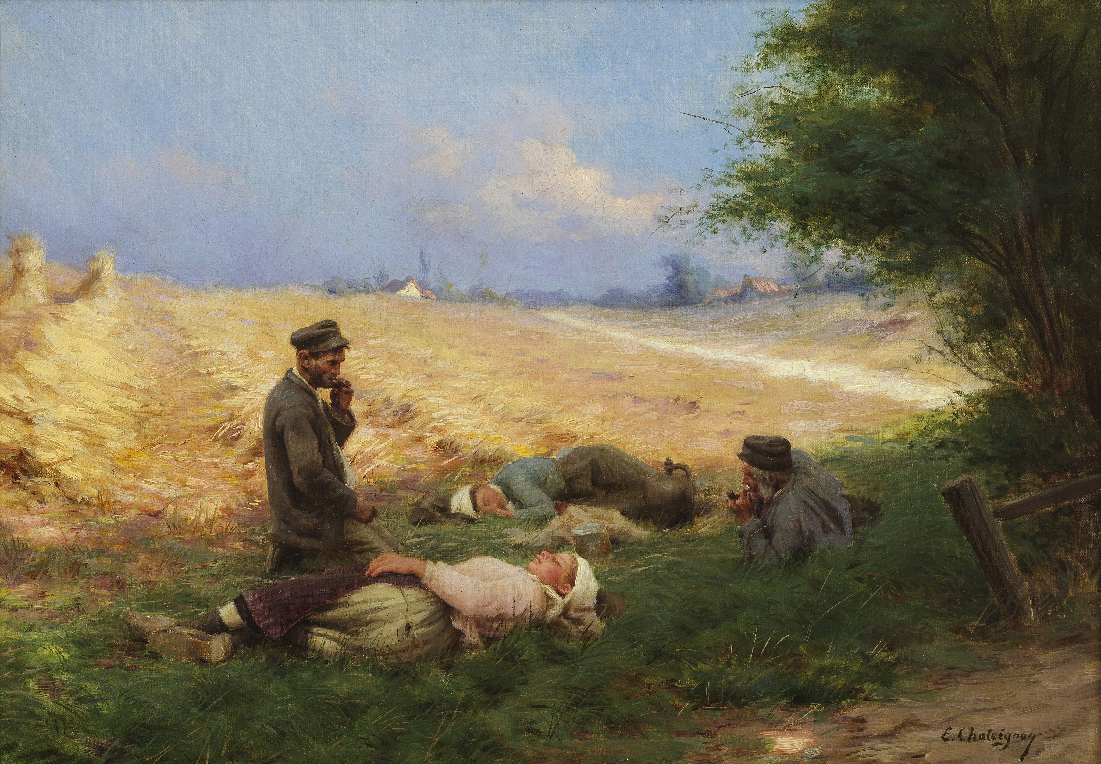 Repos dans les champs, huile sur toile, signée, 30x45 cm