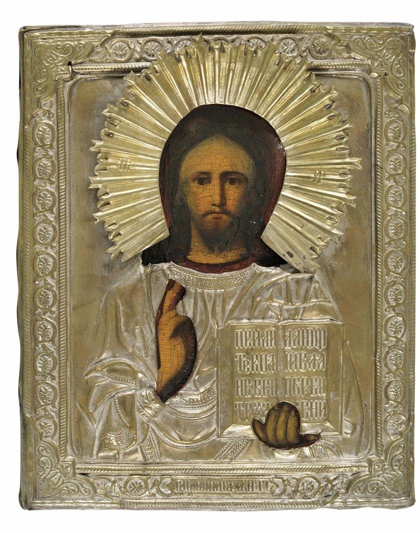Icône russe, tempera sur panneau, oklade en vermeil et en argent...