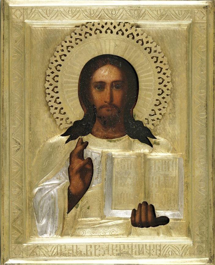 Icône russe, tempera sur panneau, oklade en métal doré, XIXe s, 18x14,4 cm