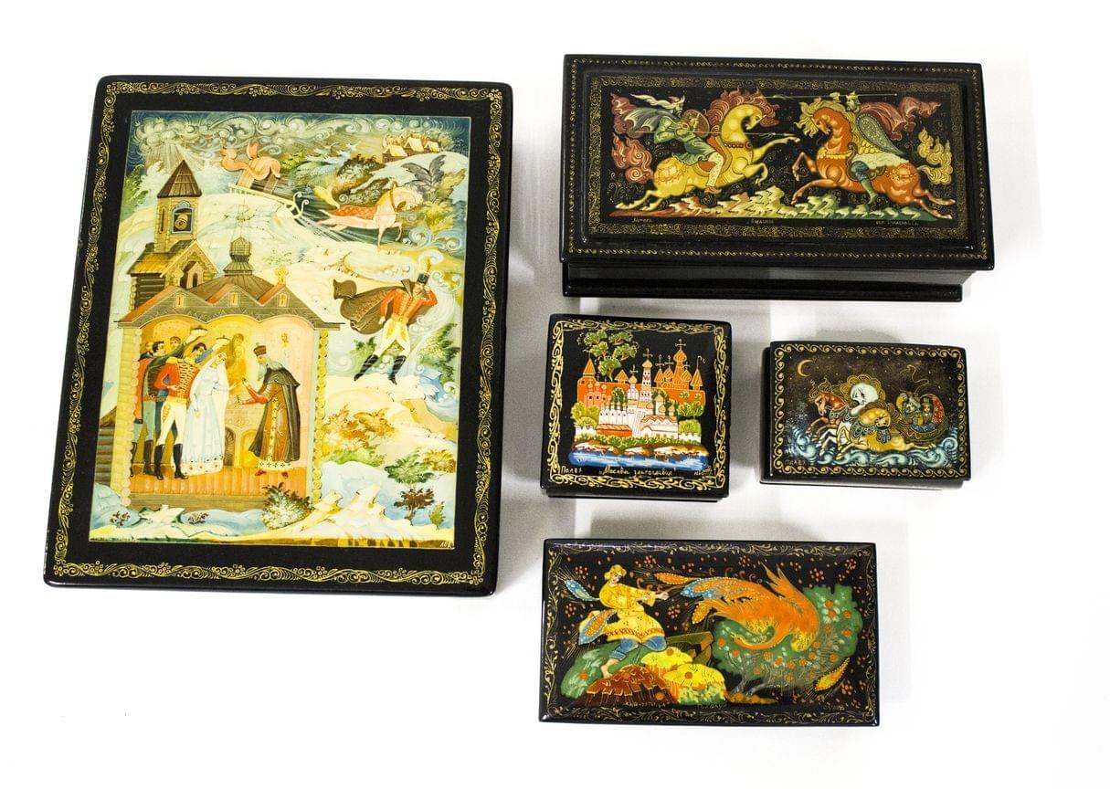 3675. Cinq boîtes à décor de scènes historiques et populaires russes