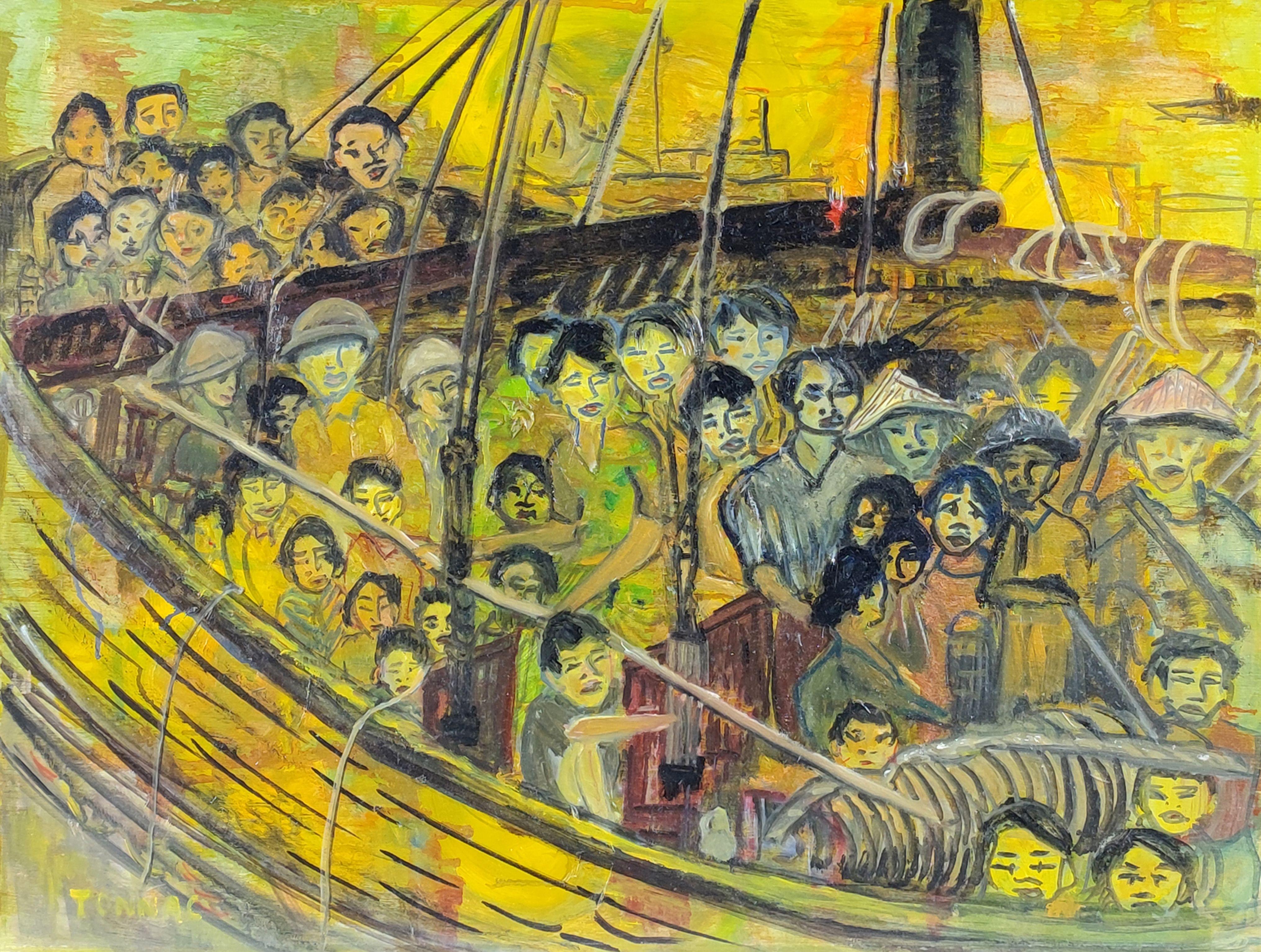 Bateau et passagers, huile sur panneau, signée 45x60 cm