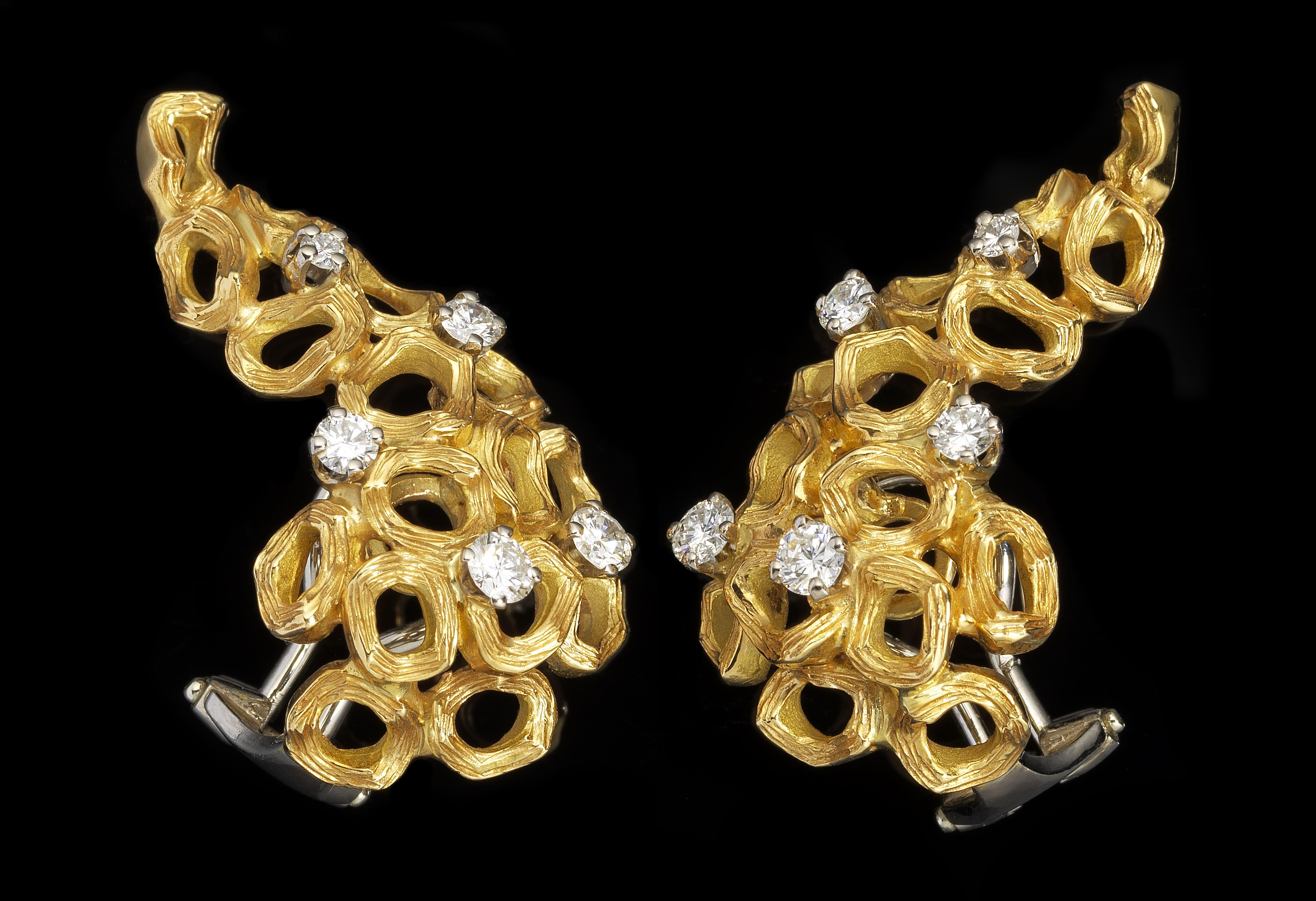 3487. Clips d'oreilles à motifs design ajourés ponctués de diamants (total env. 0,6 ct)