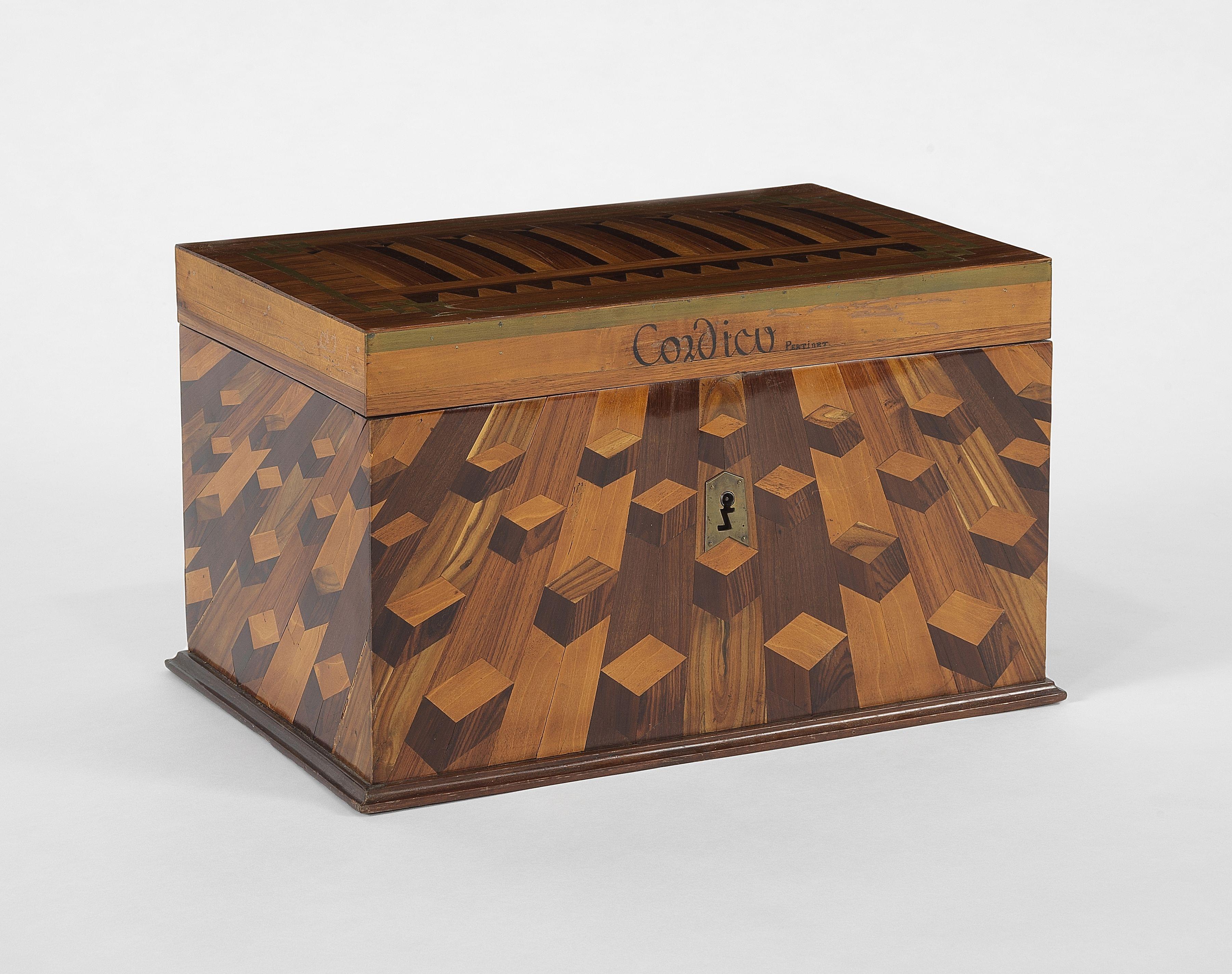 Bois de violette et bois de rose à décor marqueté de motifs géométriques, filets de laiton, 26x41x27 cm