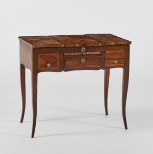 Une tablette, deux tiroirs et plateau à abattants, bois de rose et bois de violette, 79x79x45 cm