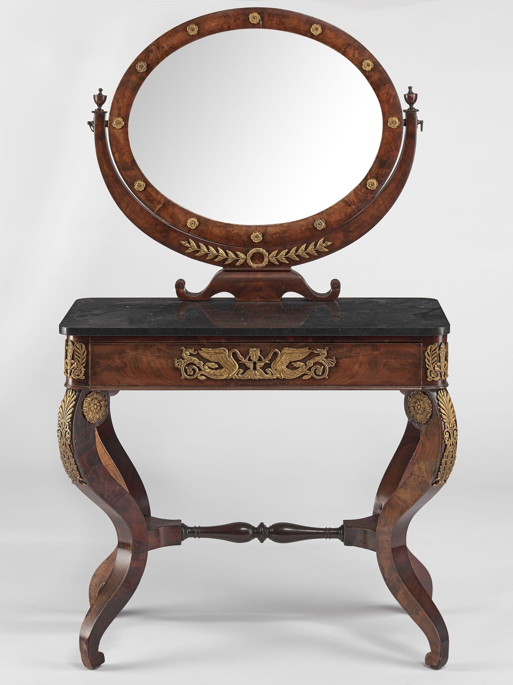 Un tiroir psyché ovale, acajou, miroir, bronze doré et marbre, 135x80x40 cm