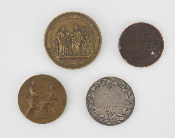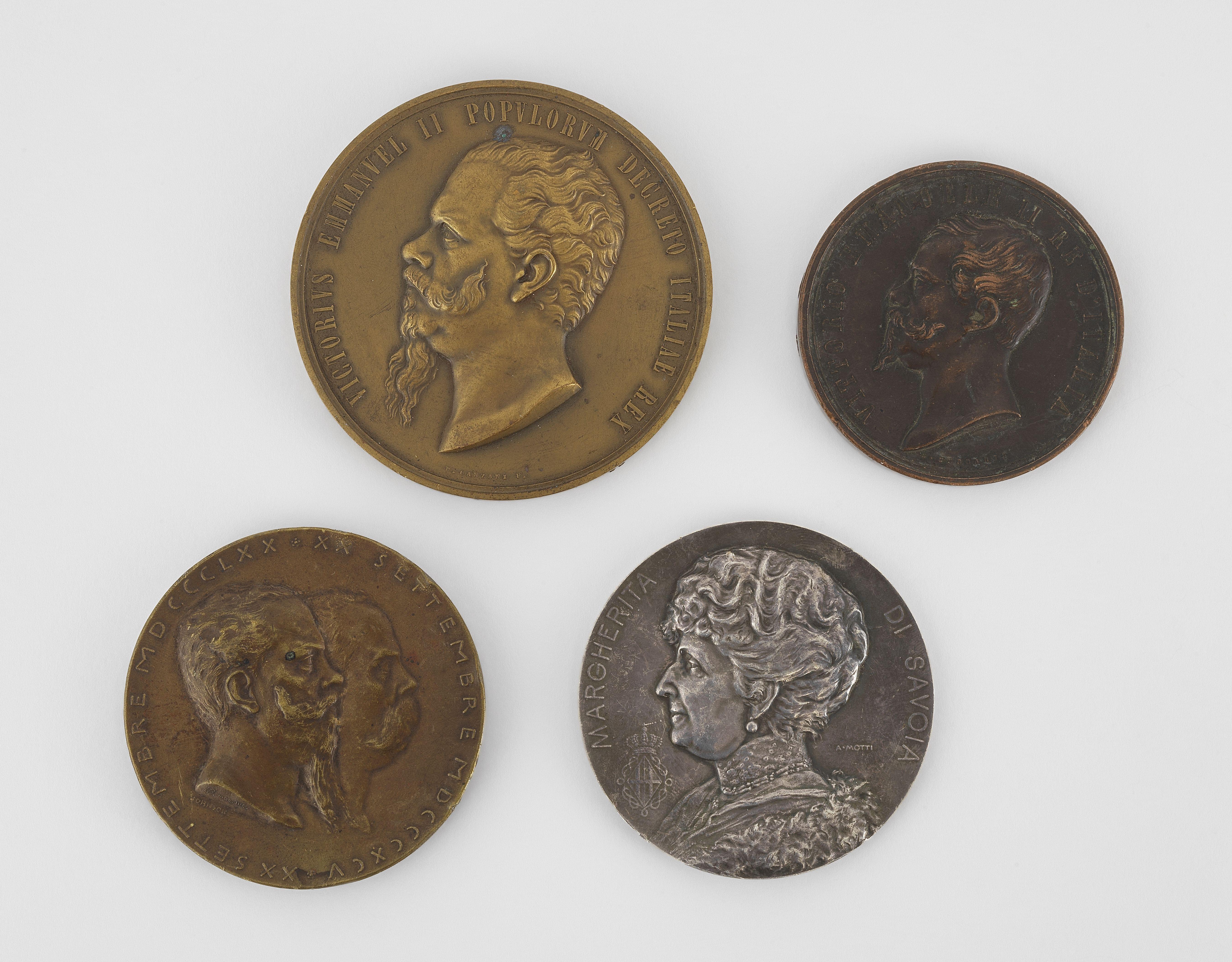 Médaille de Victor-Emmanuel II pour l’union monétaire 1862; médaille de Victor-Emmanuel II pour la prise de Rome 1870; médaille de Humbert Ier, pour les 25 ans de la prise de Rome 1895; médaille de Margherita de Savoie, 1920, bronze et argent, D de 5 à 7 cm