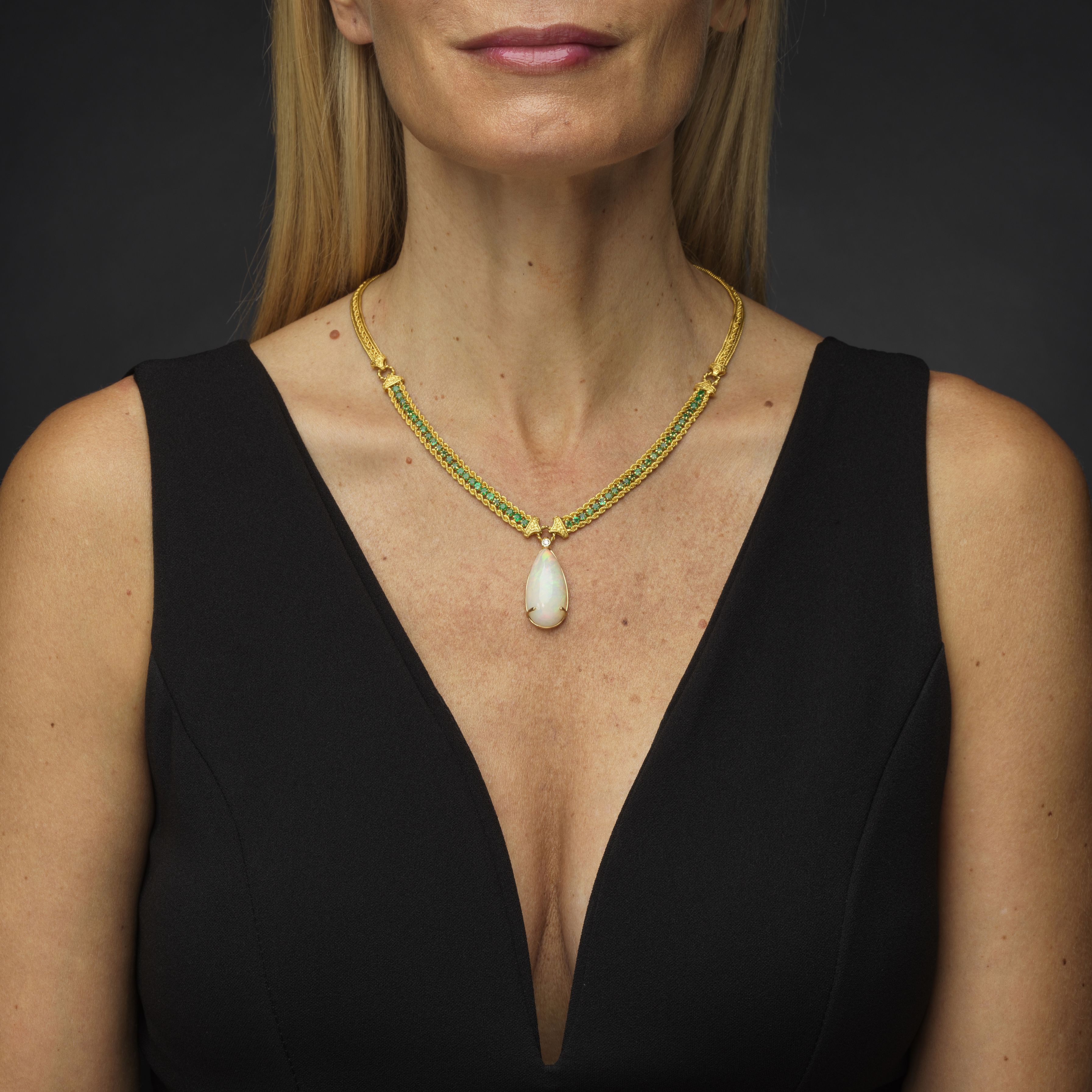 4646. Collier à maille plate torsadée stylisée retenant une opale taille cabochon poire